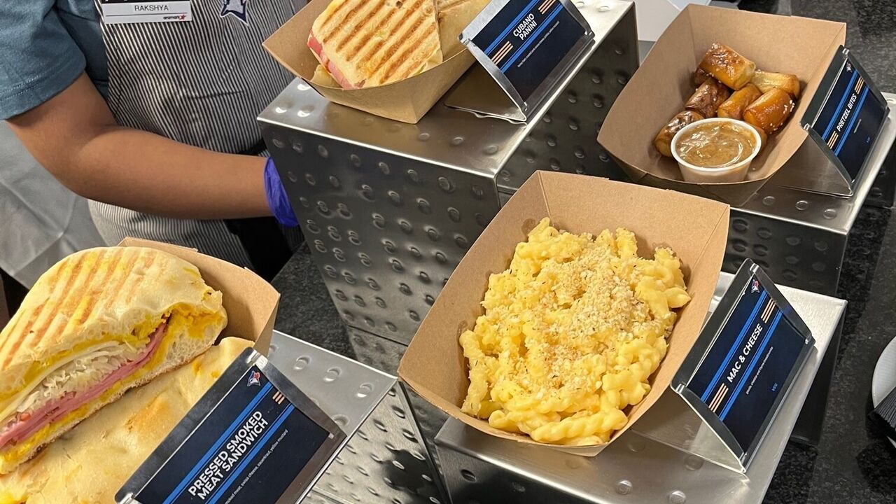 The drinks are very good. Fans can look forward to a 5-4-3 lemonade or a walk-up music watermelon margarita. There's also a caesar from The Keg. The food is located across from the bar. A pressed smoked meat sandwich, Cubano panini, and mac and cheese are among the items for grabs.