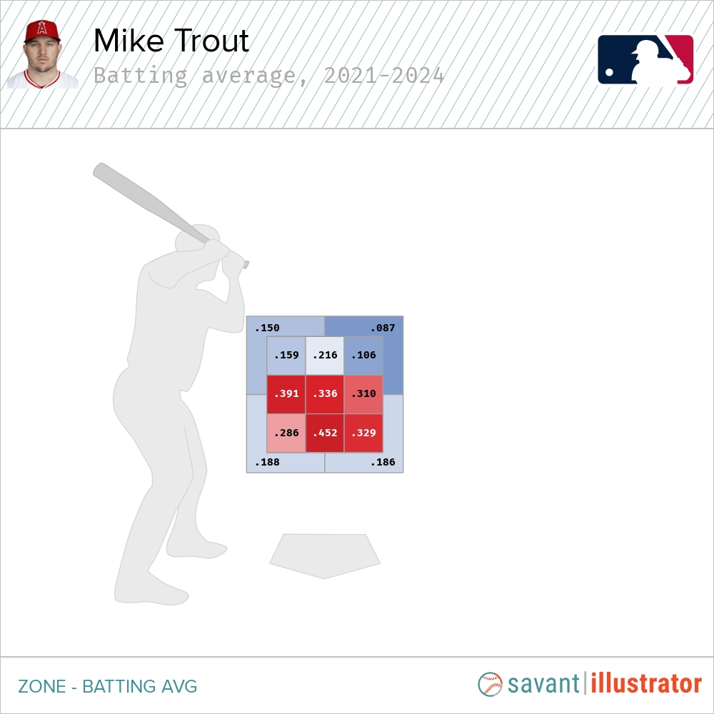 As remarkable as Trout's athletic skills and power are, his zone discipline is another superpower. He knows where his compact, powerful swing does the most damage - lower in the zone - and essentially only swings in those areas. If he can stay healthy, Trout is demonstrating he still enjoys superstar talent. Hopefully, a contender can pry him away from the Angels this summer.
