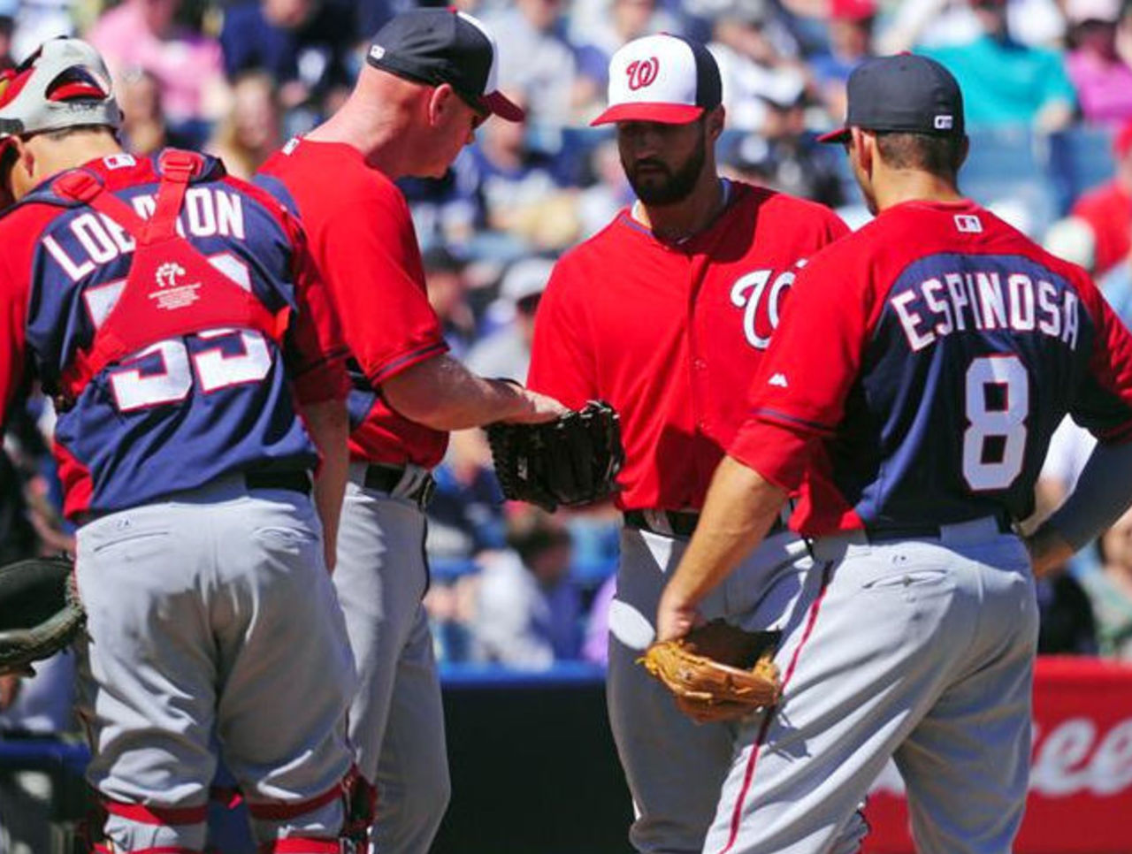 Notice something a little off about the Washington Nationals uniforms in the pic above? In case you don't, some of the players in that mound meeting are wearing blue jerseys, while others are wearing red. They all play for the same team despite these different colors, what you're seeing is the début of split-colored baseball jerseys in the Major Leagues. The front of the uniform is one colour, in this example red; while the back is another, blue here.