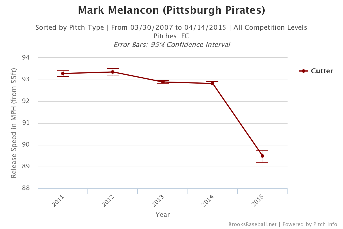 Through his first three outings this season, Melancon's cutter - his primary pitch since 2013 - has averaged only 89.49 miles per hour, a significant decrease from last season.