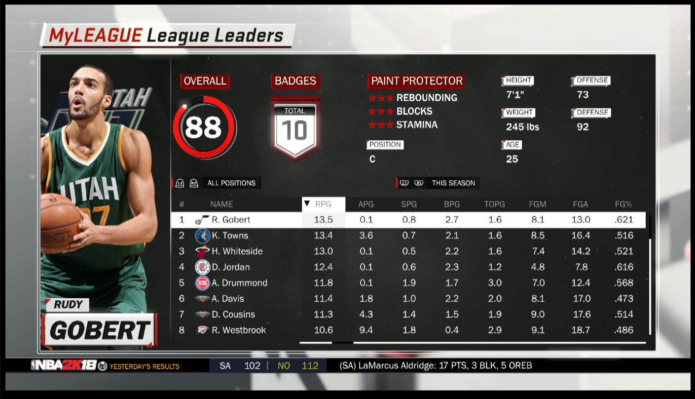 Rebounds: Rudy Gobert, Utah Jazz (13.5)