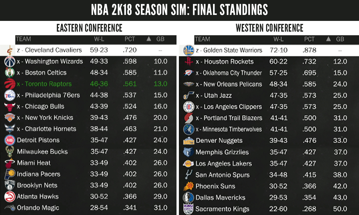 theScore's NBA team simulated the 2017-18 regular season using the NBA 2K18 video game. Injuries and trades were turned off, allowing for a more precise analysis of what each team is capable of at full strength as currently constructed.