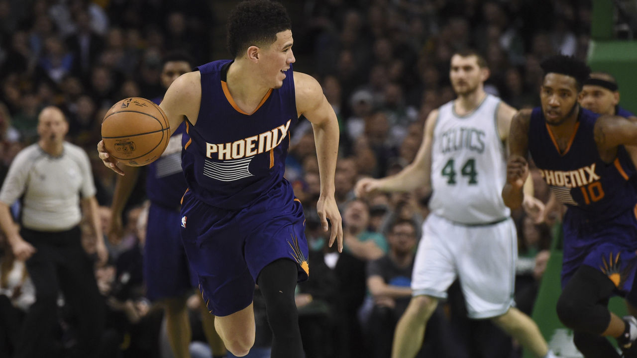 March 24: Devin Booker can't help but flash a smile as he drops 70 points on the Celtics in a career night.
