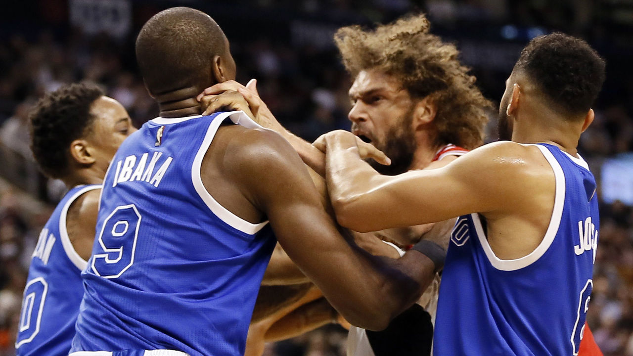 March 21: Robin Lopez is incensed after he and Serge Ibaka barely miss trading heavy blows in a late-season brawl.