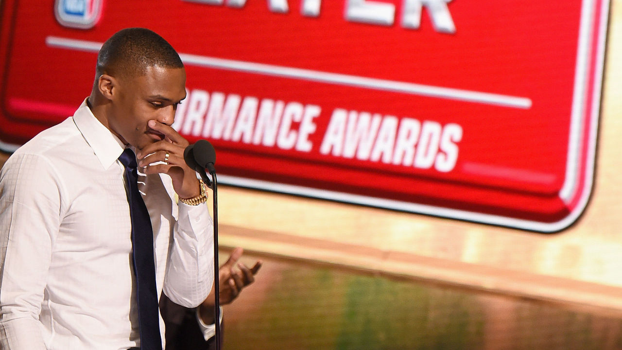 June 26: Russell Westbrook chokes up slightly as he thanks his family during his MVP acceptance speech.