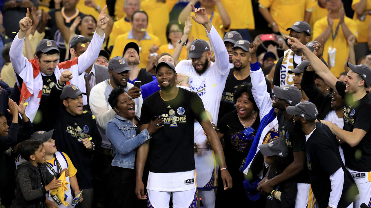 June 12: Kevin Durant is surrounded by his Warriors teammates and his cheering mother after winning his first NBA title and being named Finals MVP.