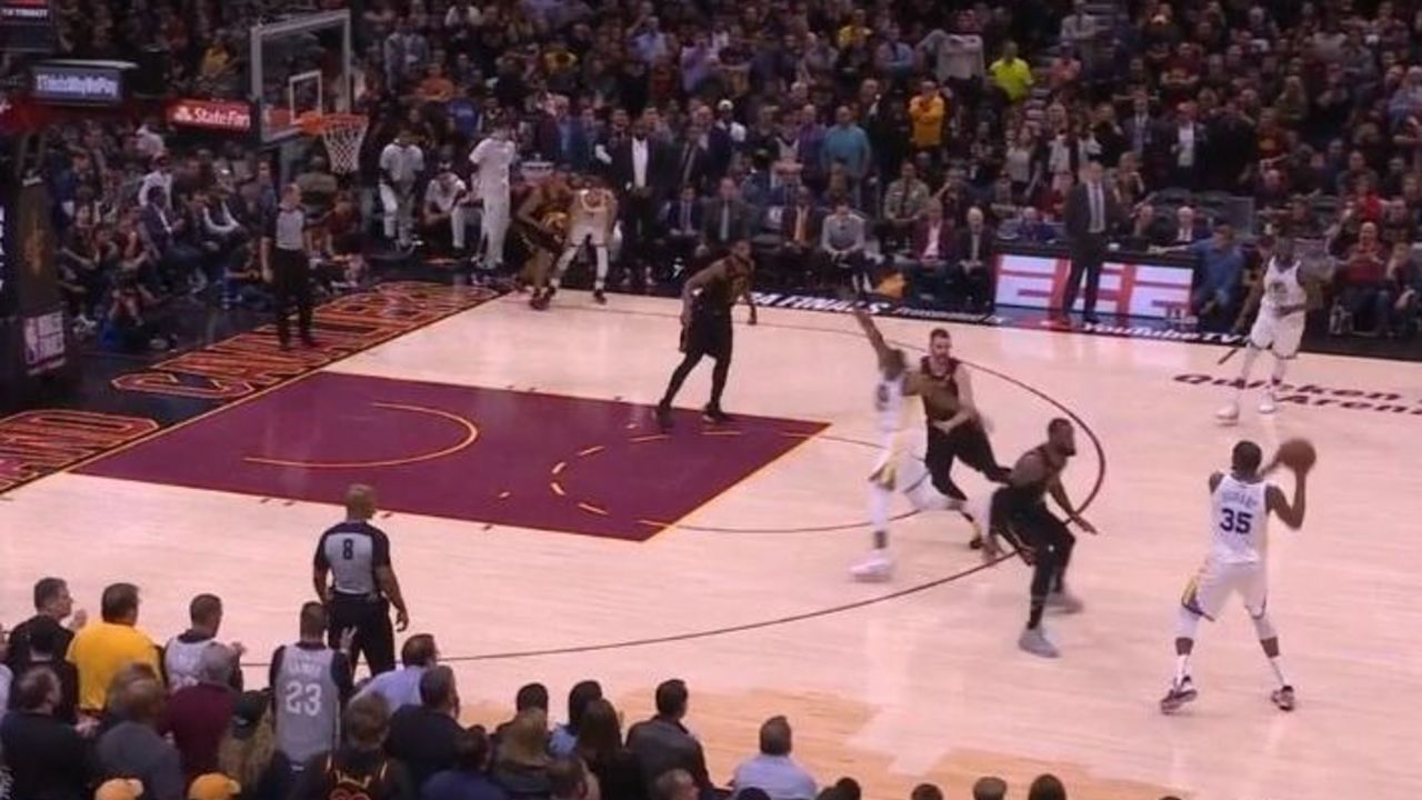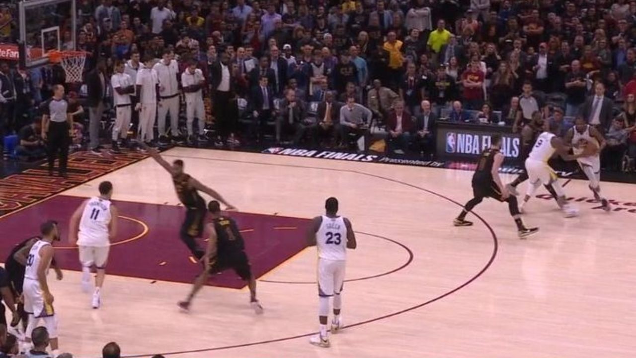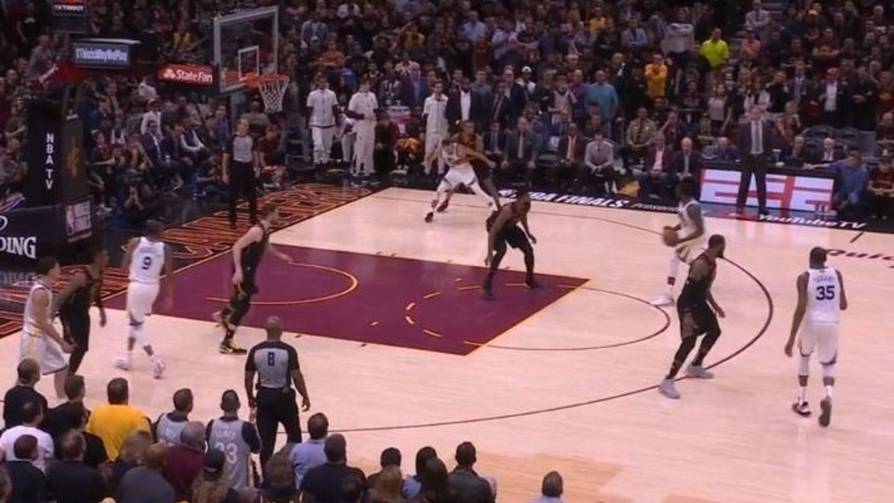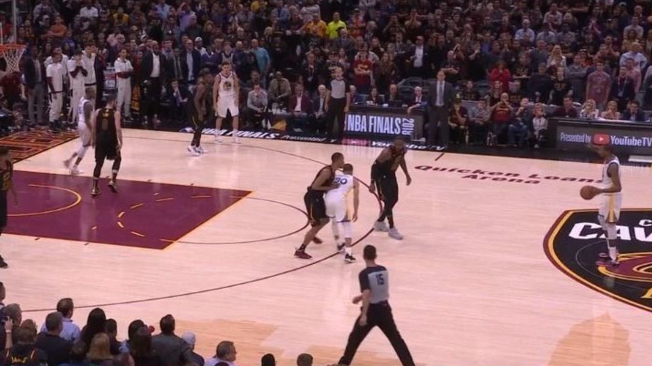 The Cavaliers didn't try particularly hard to keep James on Durant, as the Warriors introduced a switch with Hood on Durant with a half-hearted screen by Curry. Durant can shoot over both James and Hood, but James would probably do a better job of contesting the eventual shot.