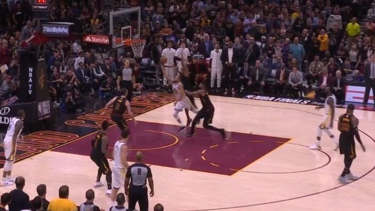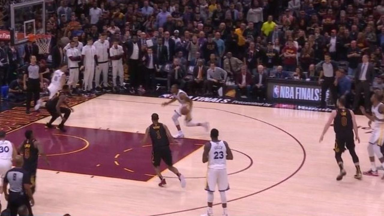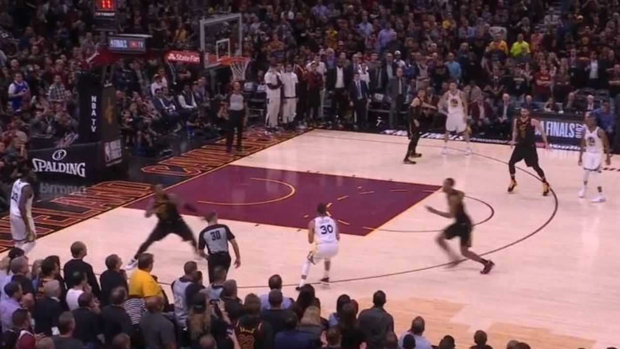 Love shows high against Durant while James fights over the screen, which leaves Iguodala an easy opportunity to slip to the rim. Tristan Thompson was busy chasing Klay Thompson on a cut to the corner, so he recognizes the action too late, and ends up getting posterized by Iguodala.
