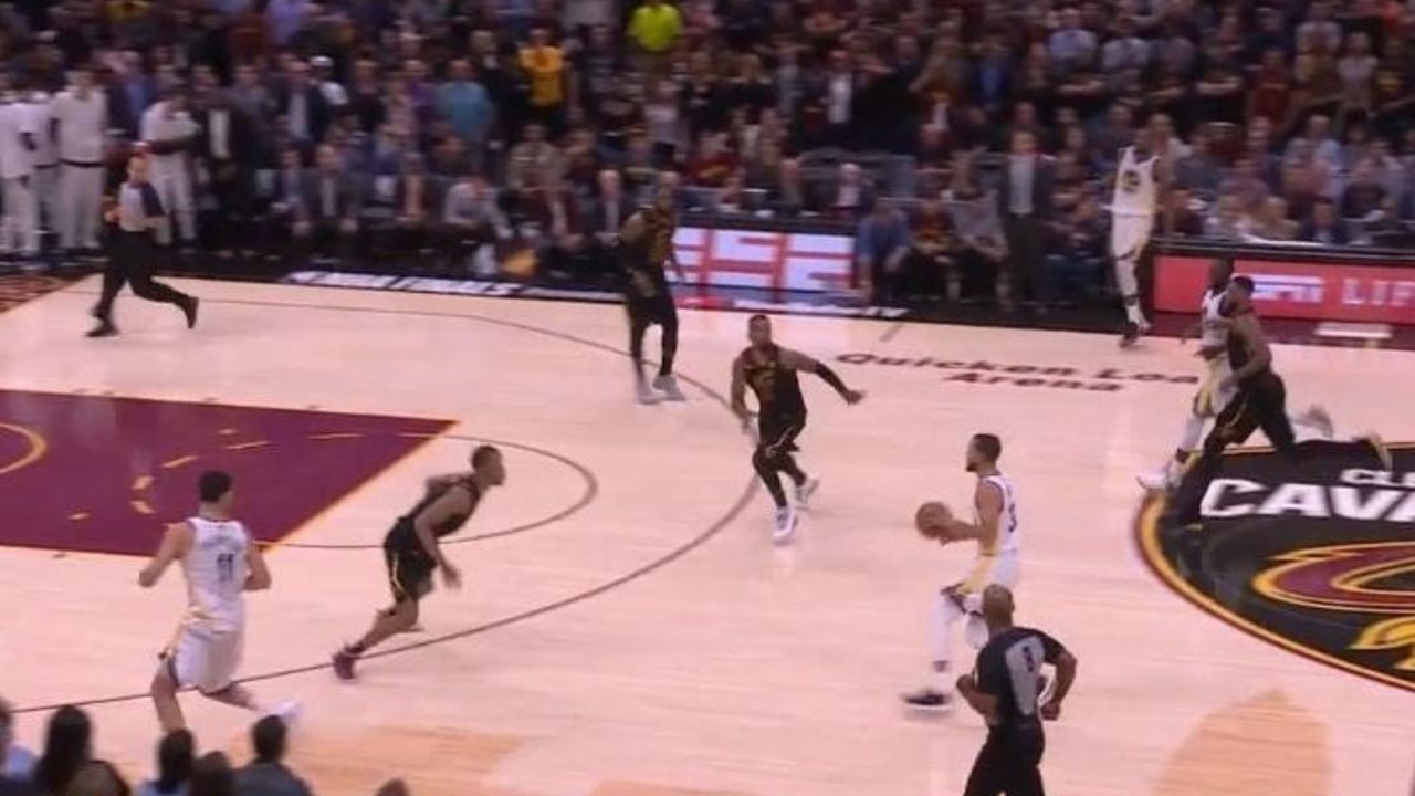 After recording a stop, the Warriors smartly attack in transition. Curry rushes up the floor and forces the Cavaliers into making a tough decision with him and Klay Thompson spacing the floor.