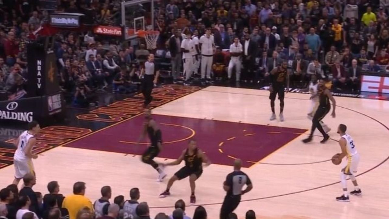 Tristan Thompson sags off the non-shooter in Green to protect the basket, but that opens up a potential pin-down scenario if Curry curls around Green, so J.R. Smith carefully positions himself to trail Curry closely to deny the pass.