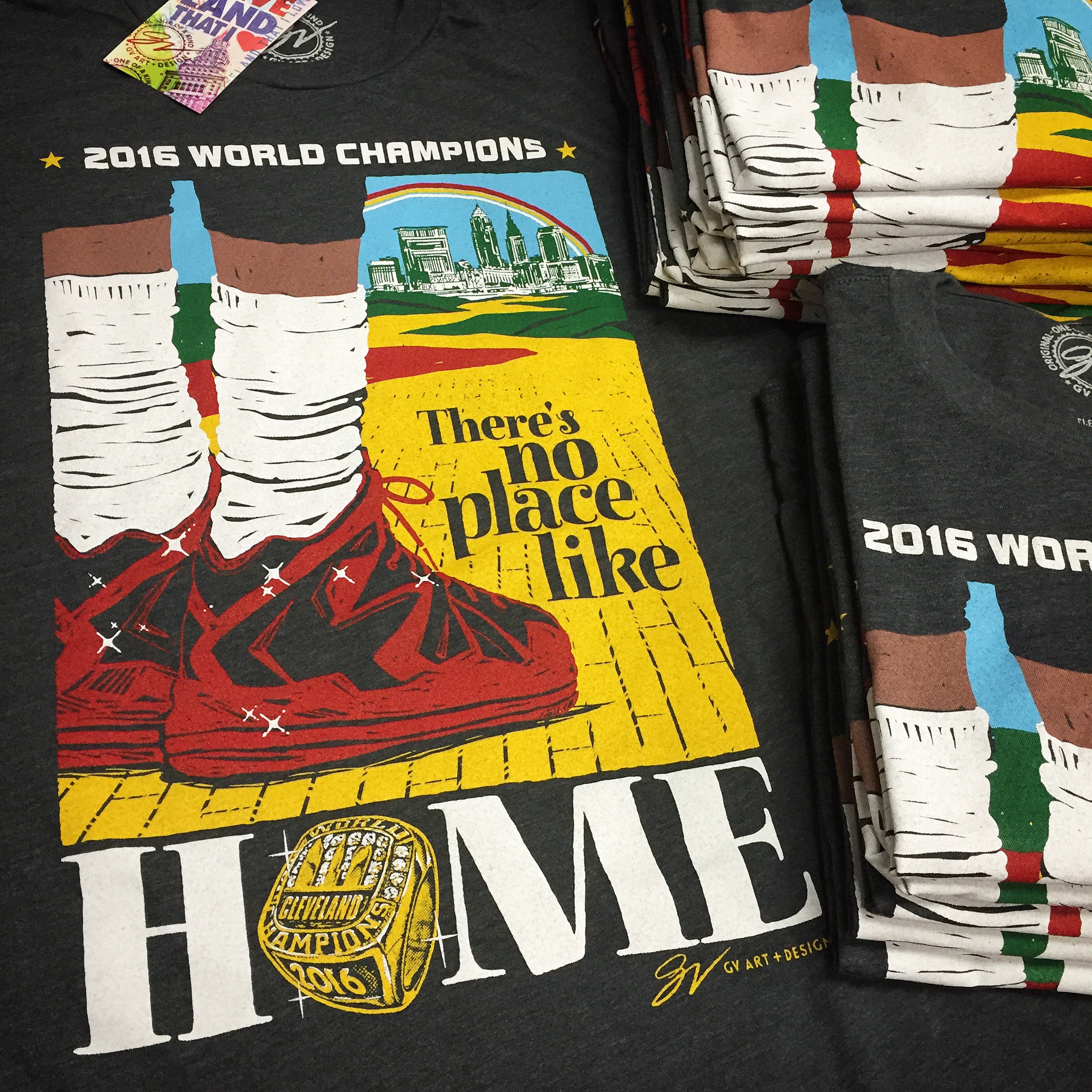 It’s a T-shirt featuring an interpretation of James’ signature basketball sneakers standing on a Yellow Brick Road leading into the Cleveland skyline. The shirt reads: “There’s no place like home.”