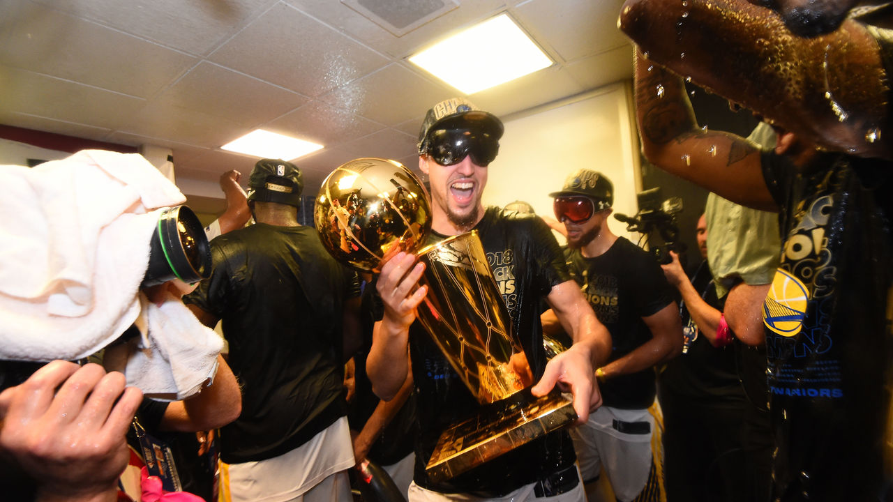 While champagne is the party beverage of choice for sporting champions, there was also plenty of beer to be found during the Warriors' festivities, and one of the most down-to-earth moments of the night saw Klay Thompson briefly escape to a back room to enjoy a brew with some of the Quicken Loans Arena staff that tend to the visitors' locker room.