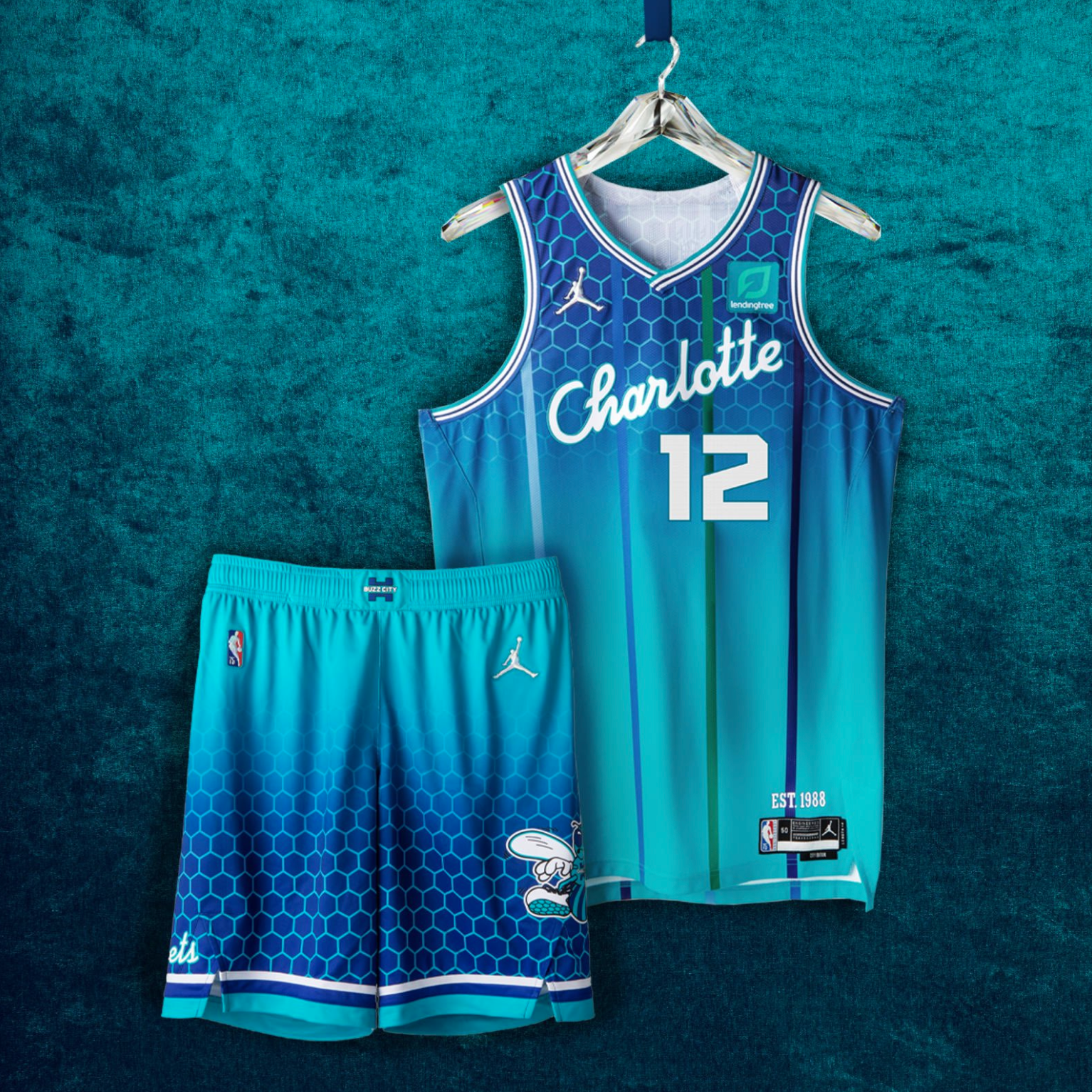 Pinstripes, honeycombs, and purple and teal combine on the jersey this team claims is honoring "30 years of milestones." This is the only City Edition jersey to feature the Jordan branding and not a Nike swoosh, presumably because he owns the team.