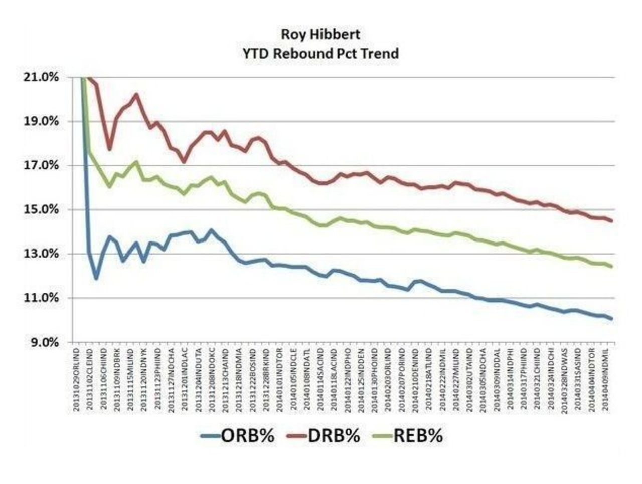 Much of the blame has fallen on the hefty shoulders of center Roy Hibbert, who finds himself at the center of the maelstrom on account of his sub-par statistical output. Although he has never ranked among the league-leaders in terms of rebounding statistics, the 7-foot-2, 290 lb center has seen a significant nose-dive in his rebounding metrics, as depicted in the graph below:
