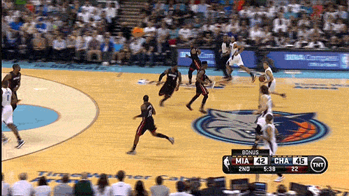 James caught the Charlotte Bobcats being a little careless on their way up the court midway through the second quarter of Game 4 on Monday and made them pay with this combination of a steal and a seemingly effortless dunk: