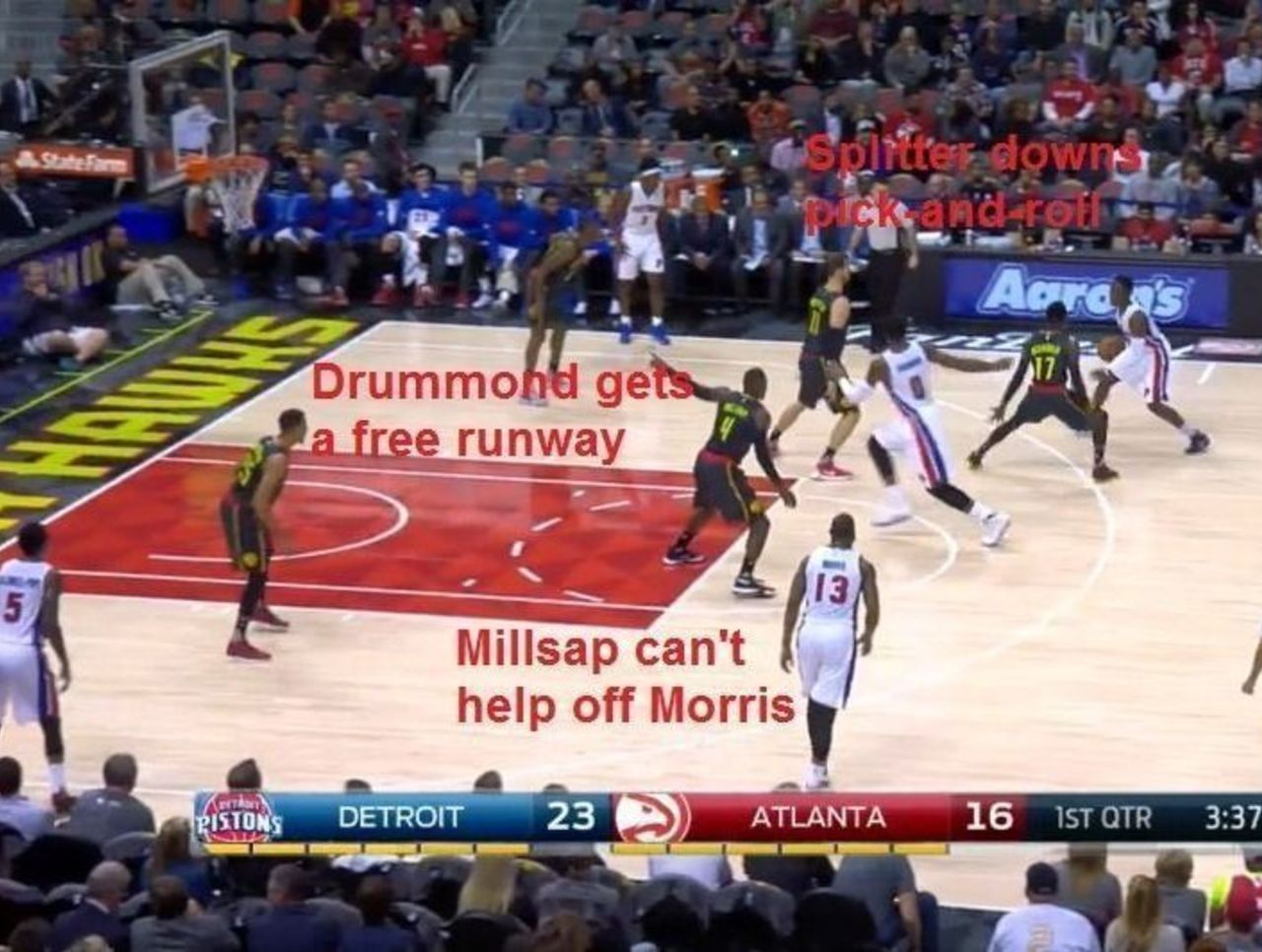 It starts with the pick-and-roll. By playing with four shooters, teams are faced with the challenge of leaving shooters open, or risking an easy lob for Drummond. On the play below, the Hawks try to contain Jackson on the perimeter, but Drummond rolls unimpeded to the hoop.