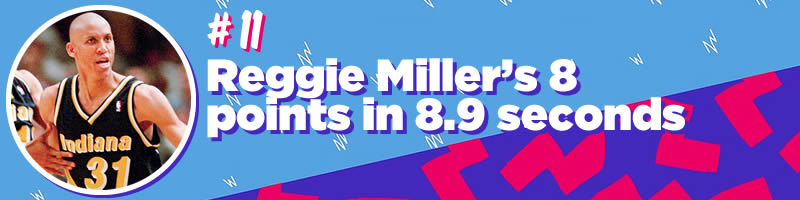 With the Pacers down 105-99 to the Knicks in Game 1 of the Eastern Conference semifinals at Madison Square Garden, and with Spike Lee talking trash with less than 20 seconds to go, Reggie Miller completed one of the most memorable sequences in NBA history, draining a three, stealing the ball on the ensuing New York inbounds play and then quickly connecting on another triple. His free throws seconds later sealed a personal 8-0 run to end the game and gave Indiana a 1-0 series lead.