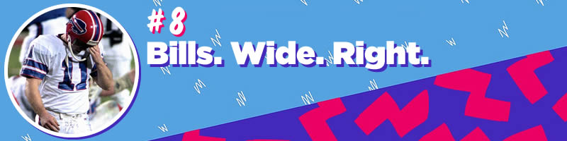 Never have two words summarized a franchise's failure quite like "wide right". Scott Norwood's slight -- so, so slight -- shank with four seconds left in Super Bowl XXV ended the first of four straight Super Bowl losses for the Buffalo Bills, this time to Bill Parcells' New York Giants in a matchup of the league's best offense and best defense that year. The combined score in the Bills' next three Super Bowl losses: 119-54.