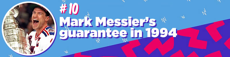 With the Rangers trailing the Devils 3-2 in the ’94 Eastern Conference Final, Mark Messier publicly guaranteed that the Rangers would win game six. It made headlines, both teams saw it, and it became A Thing. He went on the score a natural hat-trick in the third period (with the third being an empty-netter), and now people compare it to Babe Ruth calling his shot. That’s a bit heavy-handed, but it was pretty impressive.