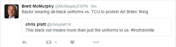 However, Bears receiver Chris Platt tweeted that the black uniforms mean more than just a jersey shakeup, punctuating his message with #truthdontlie: a hashtag used by Baylor coaches to protest former head coach Art Briles' firing, according to Brett McMurphy of ESPN.