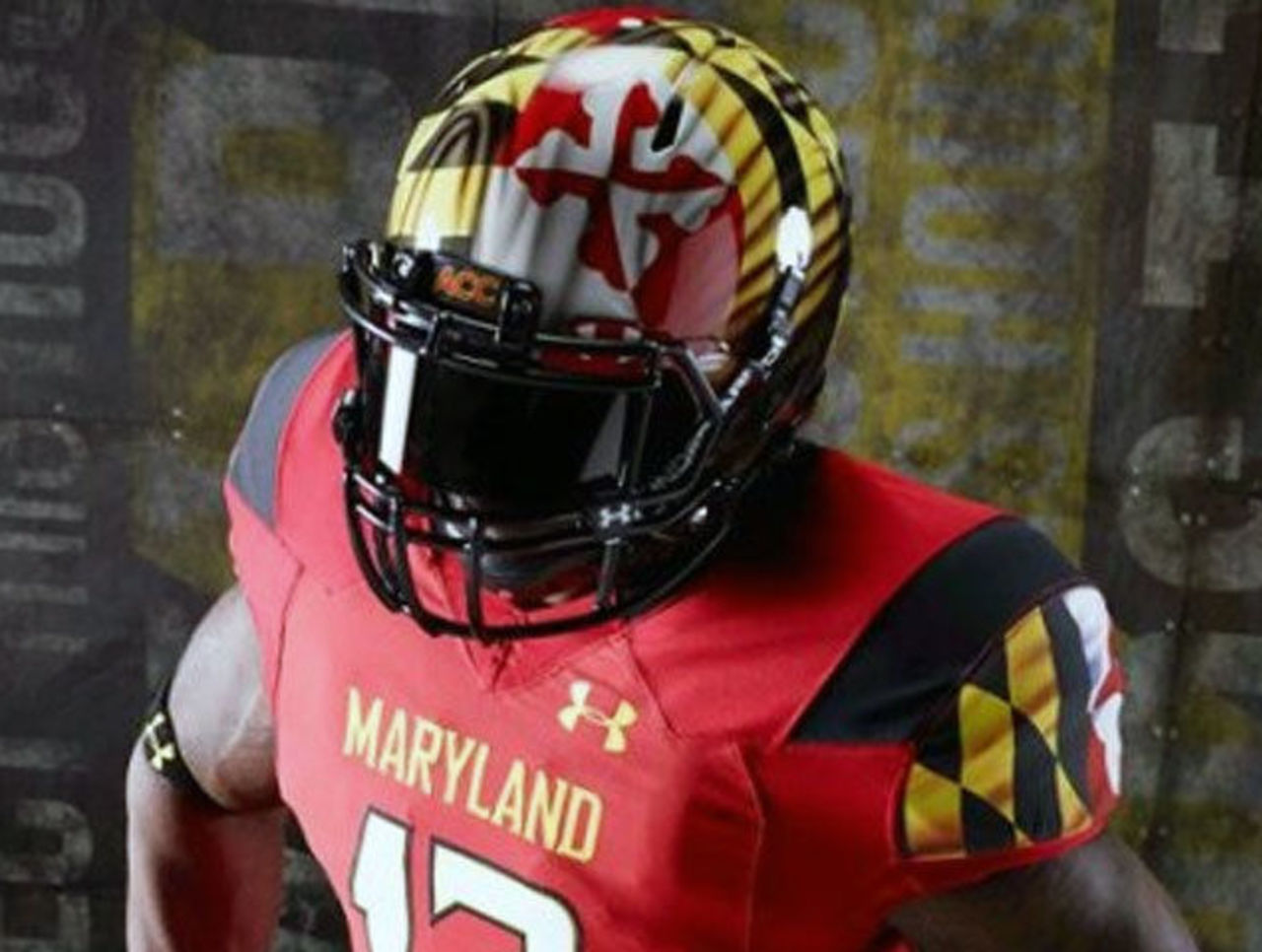 The state of Maryland has one of the more unique flags in all of North America, it's no surprise then that several of their sports teams such as the Baltimore Orioles and Baltimore Ravens make use of it on their uniforms. But no team in Maryland can hold a candle to the Terrapins and these state flag-wrapped helmets, a design I absolutely love save for the unnecessary "MARYLAND" in graffiti-style spraypaint over the flag on the back. Sometimes too much of too much is, well, too much.