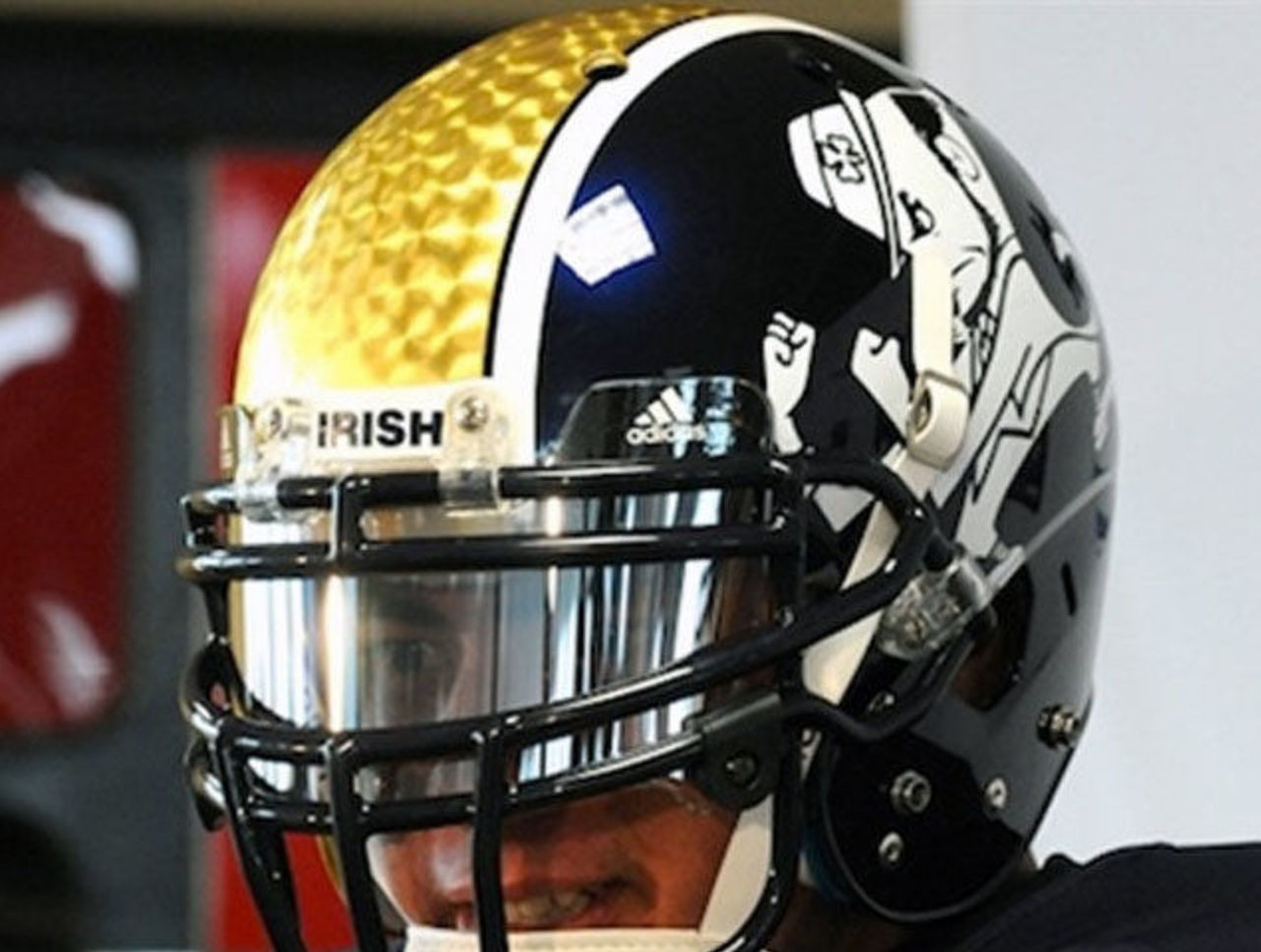 Even a team smothered in tradition like the Notre Dame Fightin' Irish couldn't resist the urge to break out a crazy helmet once in a while. In 2012 the Fightin' Irish did just with their special "Shamrock Series" game helmet, three-fifths yellow, the rest blue with a giant version of their fightin' leprechaun logo on just the one side. This design caused all sorts of backlash among fans and the media. Like the Hokies above, this was only worn once and then retired forever.