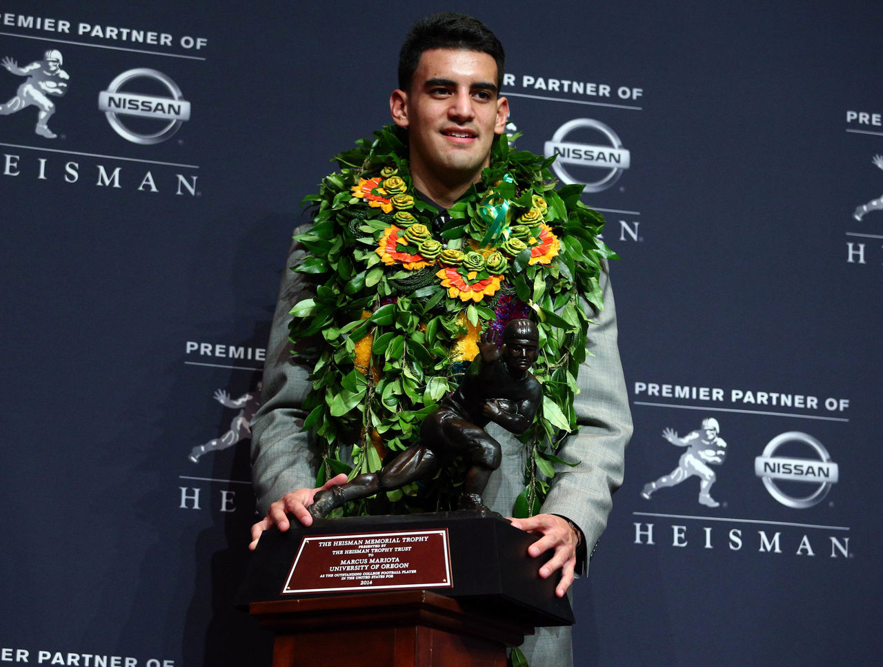 Oregon Quarterback Marcus Mariota poses with his Heisman Award trophy while wearing a special lei during the Dec. 13 ceremony.