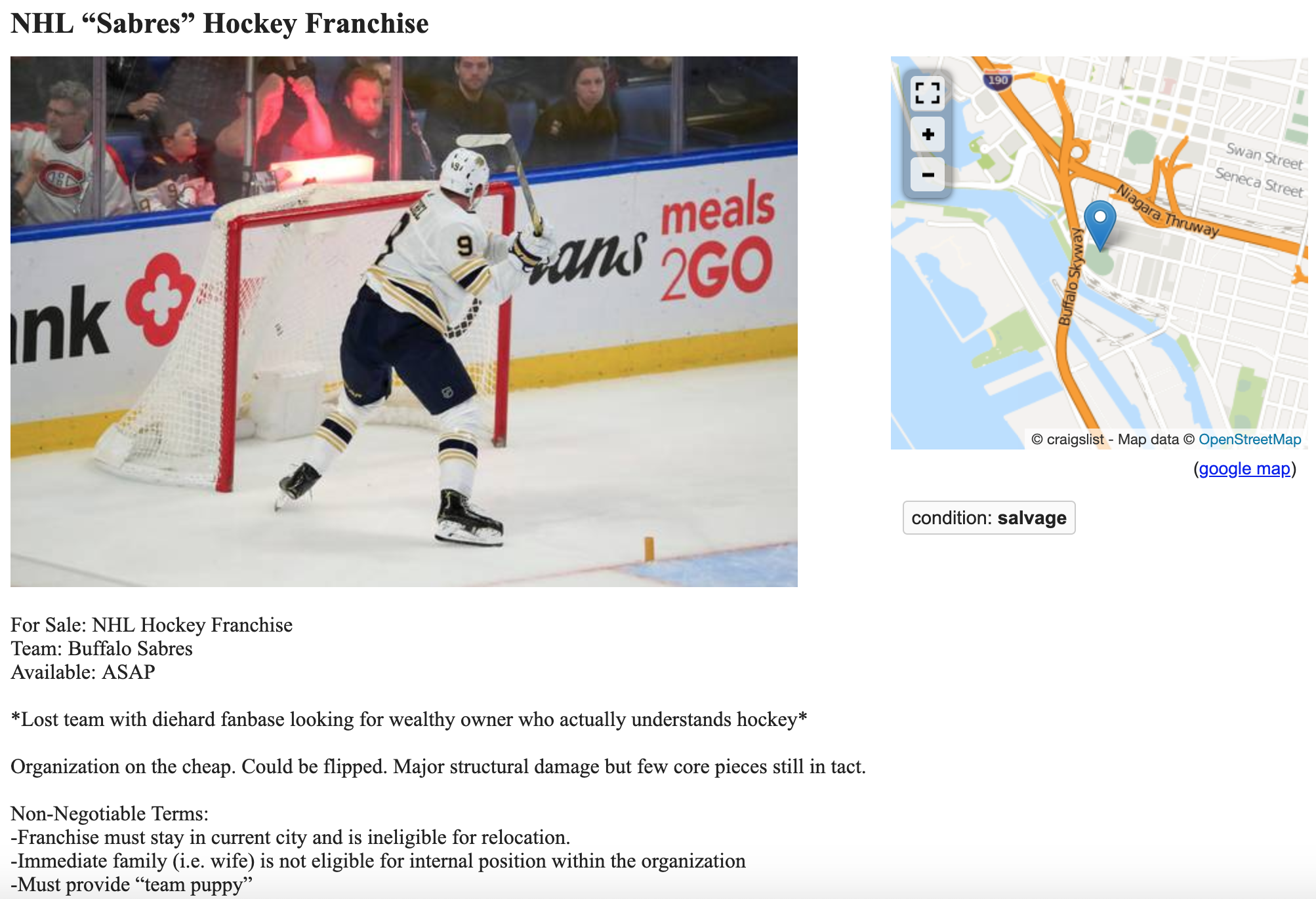 A listing posted Wednesday on the "for sale" section of the Buffalo Craigslist website says the Sabres are in need of a "wealthy owner who actually understands hockey."