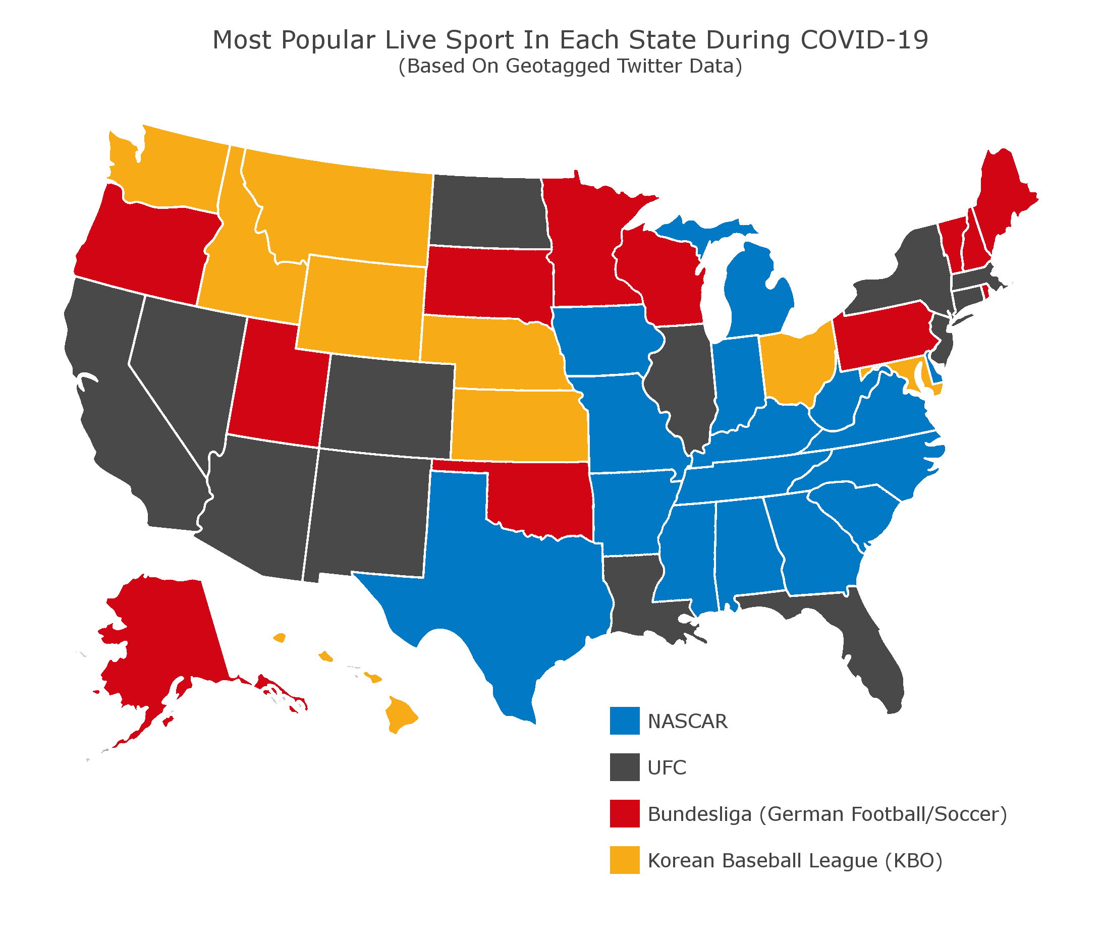 A map that Sportsbetting.ag created based on geotagged Twitter data gathered over the last month - featuring over 100,000 tweets - shows NASCAR is currently the most popular live sport in the United States, followed closely by the UFC, the German Bundesliga, and the Korean Baseball Organization.