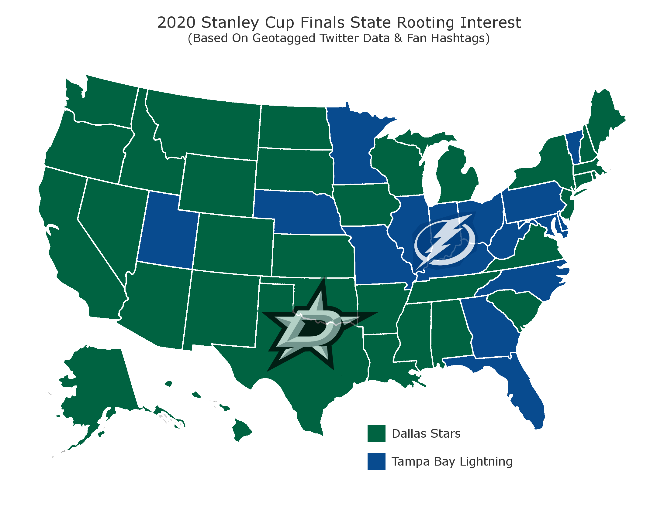 Using over 80,000 geotagged tweets, including hashtags such as #GoStars and #GoBolts, since the start of the Stanley Cup Final, Betonline.ag created a map showing which team each state is rooting for. The Stars had the most support, with 34 states backing them compared to 16 states for the Tampa Bay Lightning.