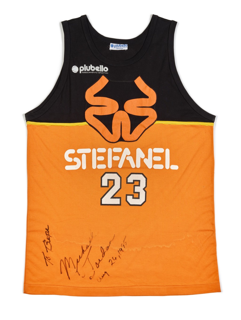 The orange-and-black Stefanel Trieste jersey Jordan wore when he made a backboard-shattering dunk during a 1985 Nike exhibition game in Trieste, Italy is being auctioned off by Sotheby's. Bidding starts at $300,000 and will remain open until Dec. 3.