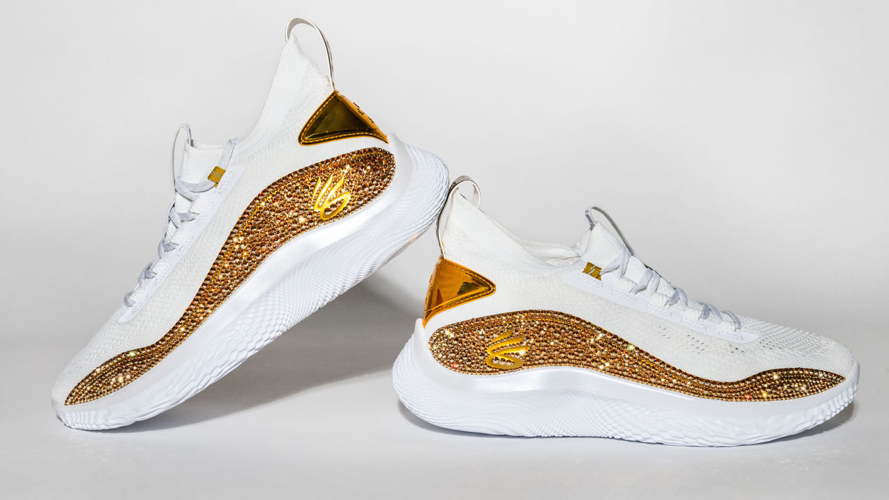 The Curry Flow 8 "24K" was designed by Los Angeles-based artist Dan Life, who has also collaborated with the Golden State Warriors star to launch The Good Shop by Dan Life x Curry at ComplexLand, and is limited to three pairs. Each pair contains 6,149 crystals and is worth $3,500.