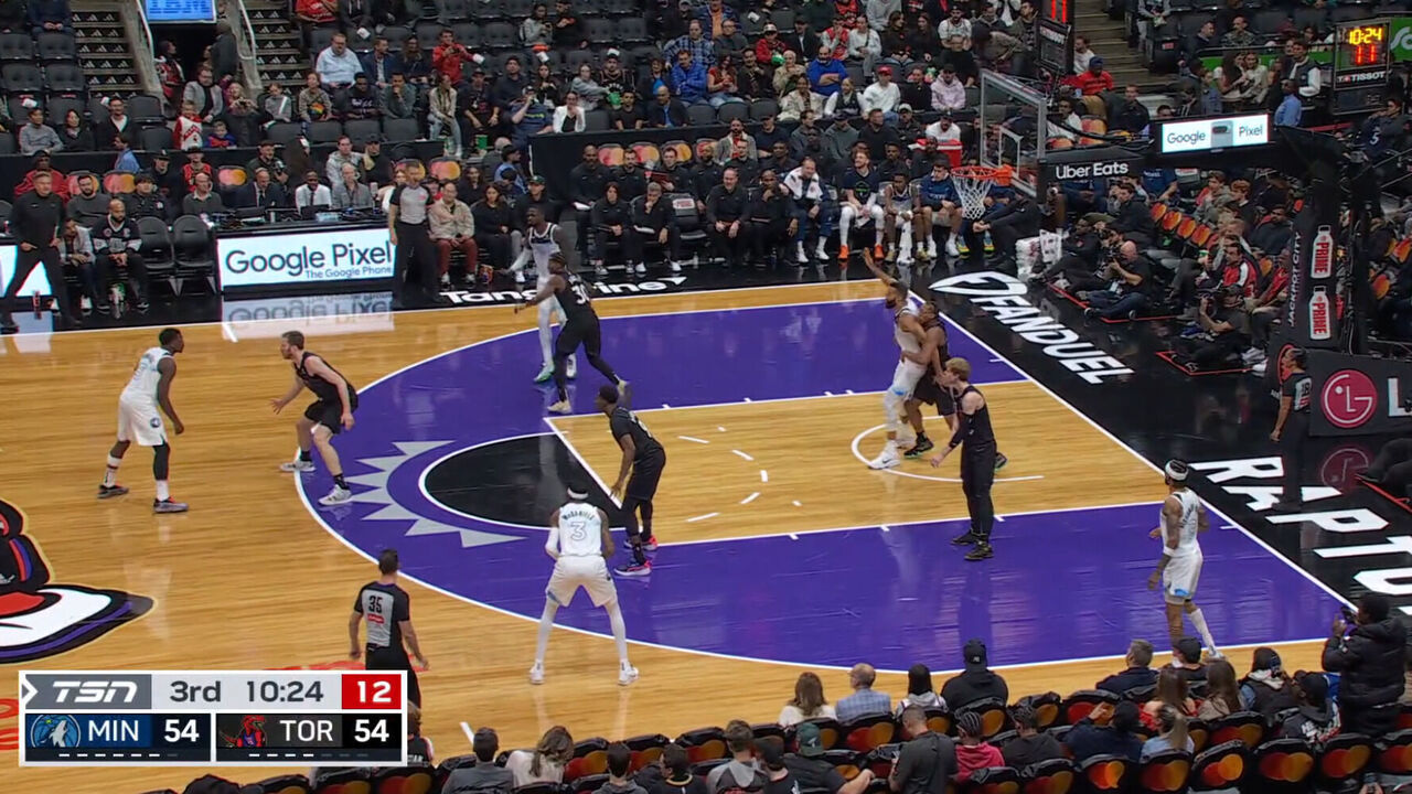 But Edwards, who had drawn Raptors center Jakob Poeltl on a switch, decided against throwing the moderately risky pass over a 7-footer to his not-so-sure-handed teammate. Instead, as Gobert begrudgingly vacated the paint, Edwards attacked Poeltl off the bounce, drew help off the strong-side corner, and kicked out to Julius Randle for a pretty good look at a three. Randle clanked it off the heel, part of a 1-for-6 shooting night from deep.
