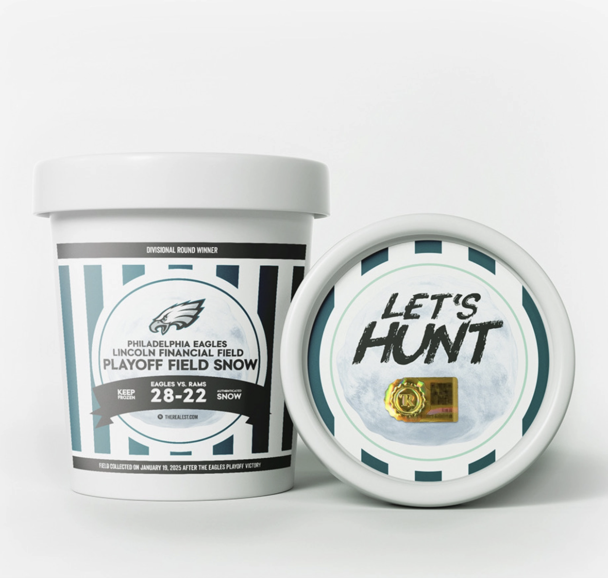 Insulated containers of snow collected from the end zone after Sunday's game were put up for sale through the Eagles' memorabilia marketplace, The Realest, with a price tag of $50. As of Wednesday afternoon, the containers had already sold out.