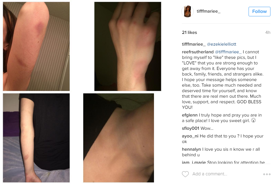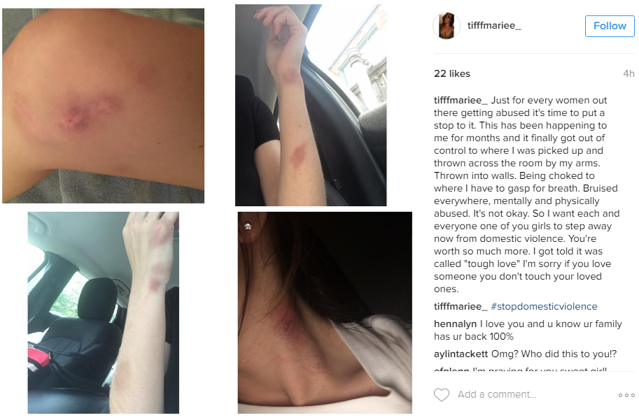 The first depicts several photos of bruises and includes a caption that references being choked and thrown into walls over a series of months. Thompson says she was told, ostensibly by her abuser, that it was "tough love."
