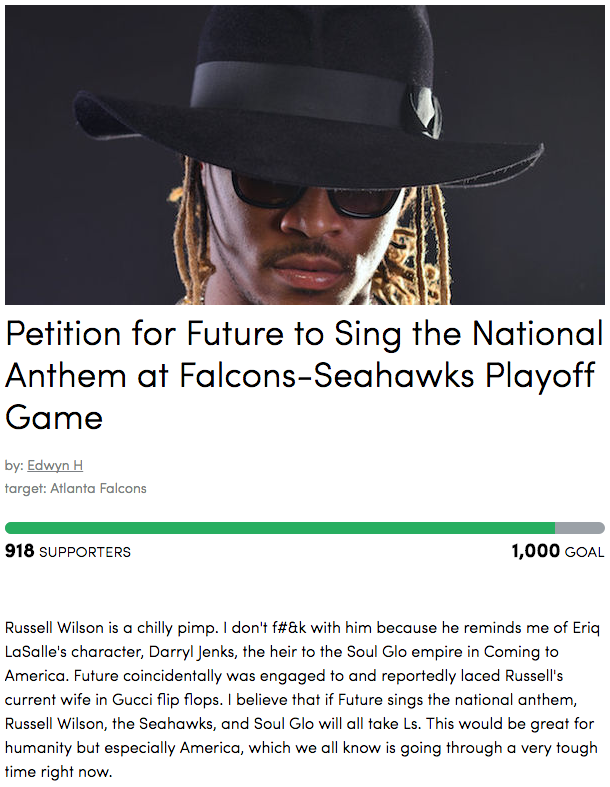 With the Atlanta Falcons hosting the Seattle Seahawks in a divisional playoff game Saturday, one fan decided it'd be funny to have Future perform the national anthem to troll Russell Wilson, and has launched a petition to make it happen.