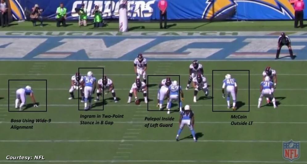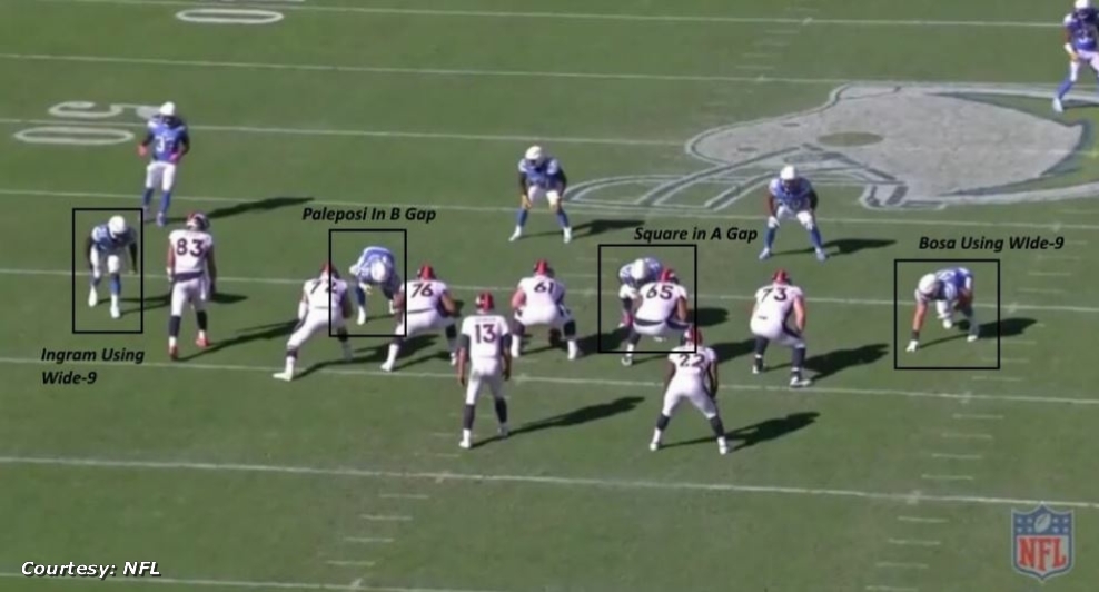 Here's a look at what the Chargers can do in their base defensive front. They often rely on the "wide-9" alignment, which puts the defensive ends well outside of the offensive tackles: