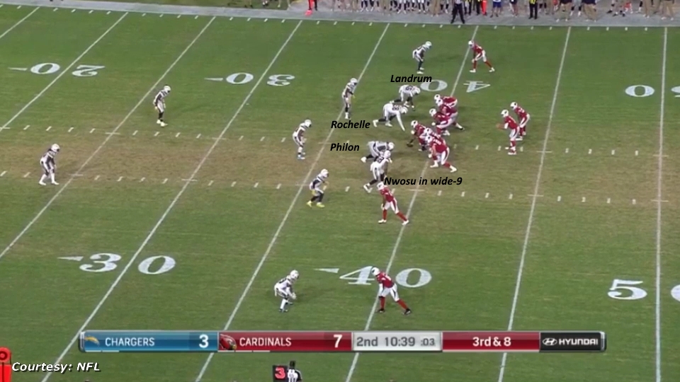Here, the Chargers have Uchenna Nwosu on one edge in the wide-9 alignment outside the left tackle and Chris Landrum on the other. Darius Philon aligns across from the left tackle, while Bosa’s backup, Isaac Rochell, kicks inside and lines up across from the right guard. Watch the pressure they apply to rookie quarterback Josh Rosen: