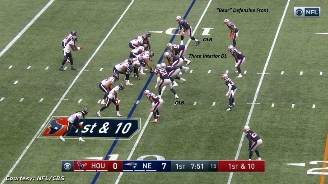 One way New England accomplished this was by using a "Bear" front, which consists of putting three down linemen on the inside, aligned across from the guard-center-guard interior, and then using linebackers Kyle Van Noy (No. 53) and Dont'a Hightower (No. 54) off the edges to help contain Watson: