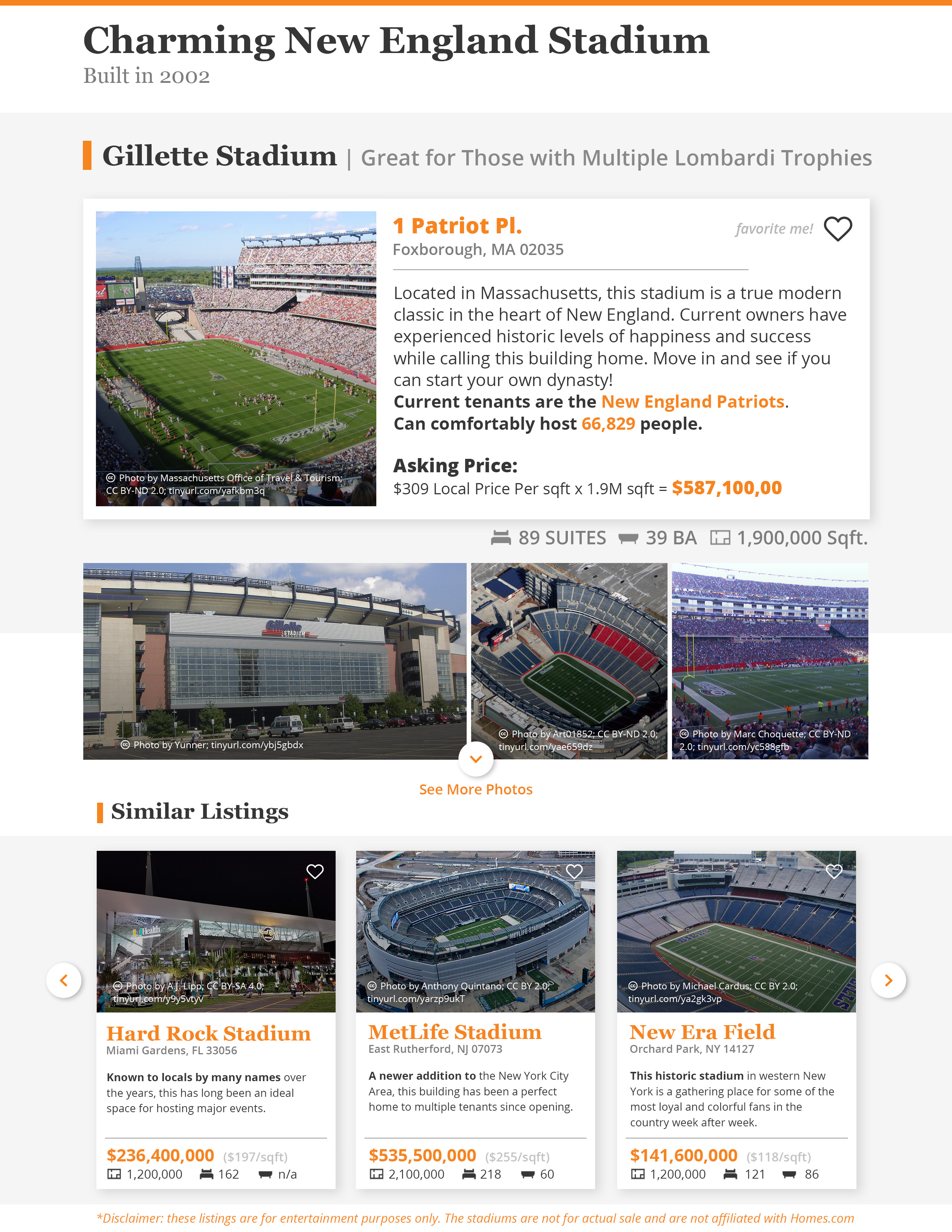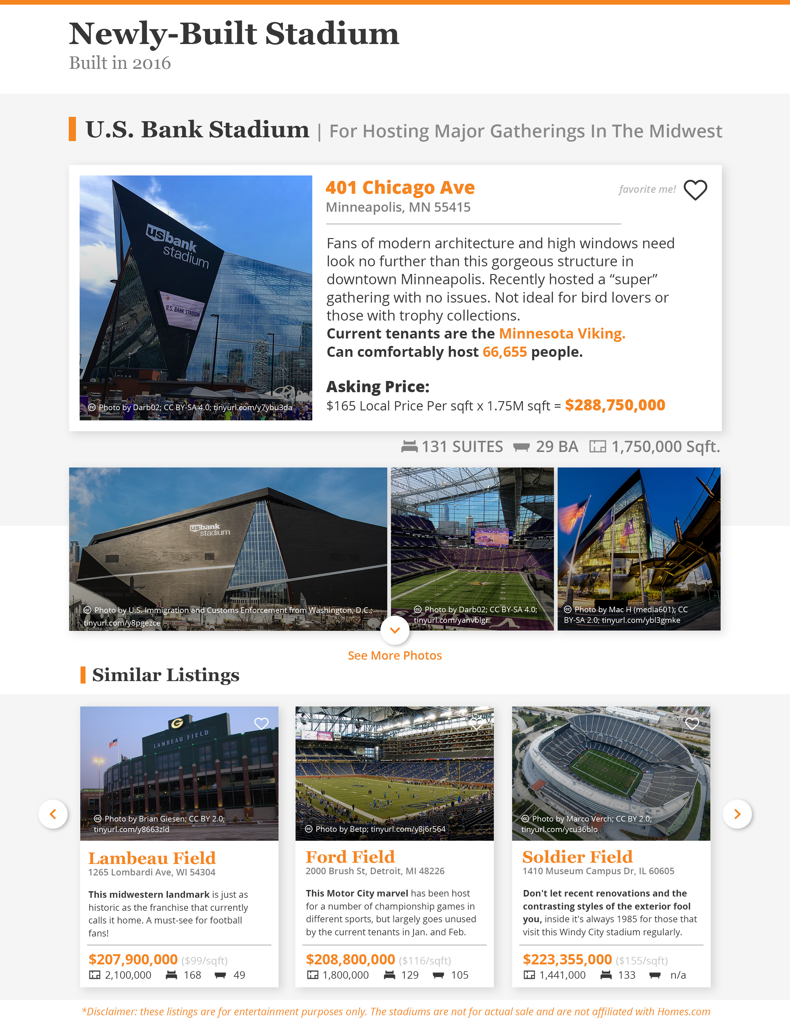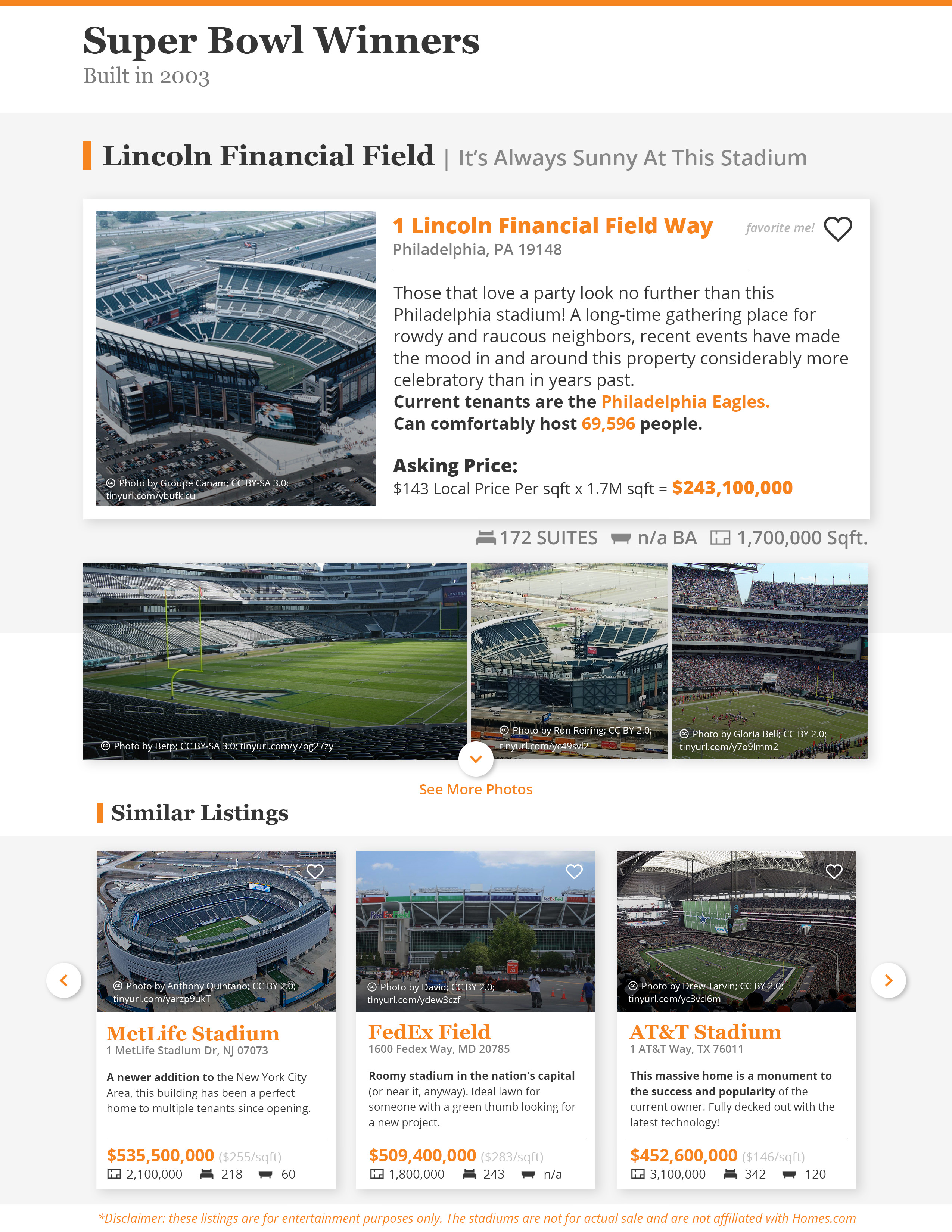 A series of infographics put together by a designer at Homes.com shows the stadiums of last season's division winners as "house for sale" listings. Each features an estimated home sale price based on the median price per square foot of the stadium's location, as well as the actual square footage of the venue.