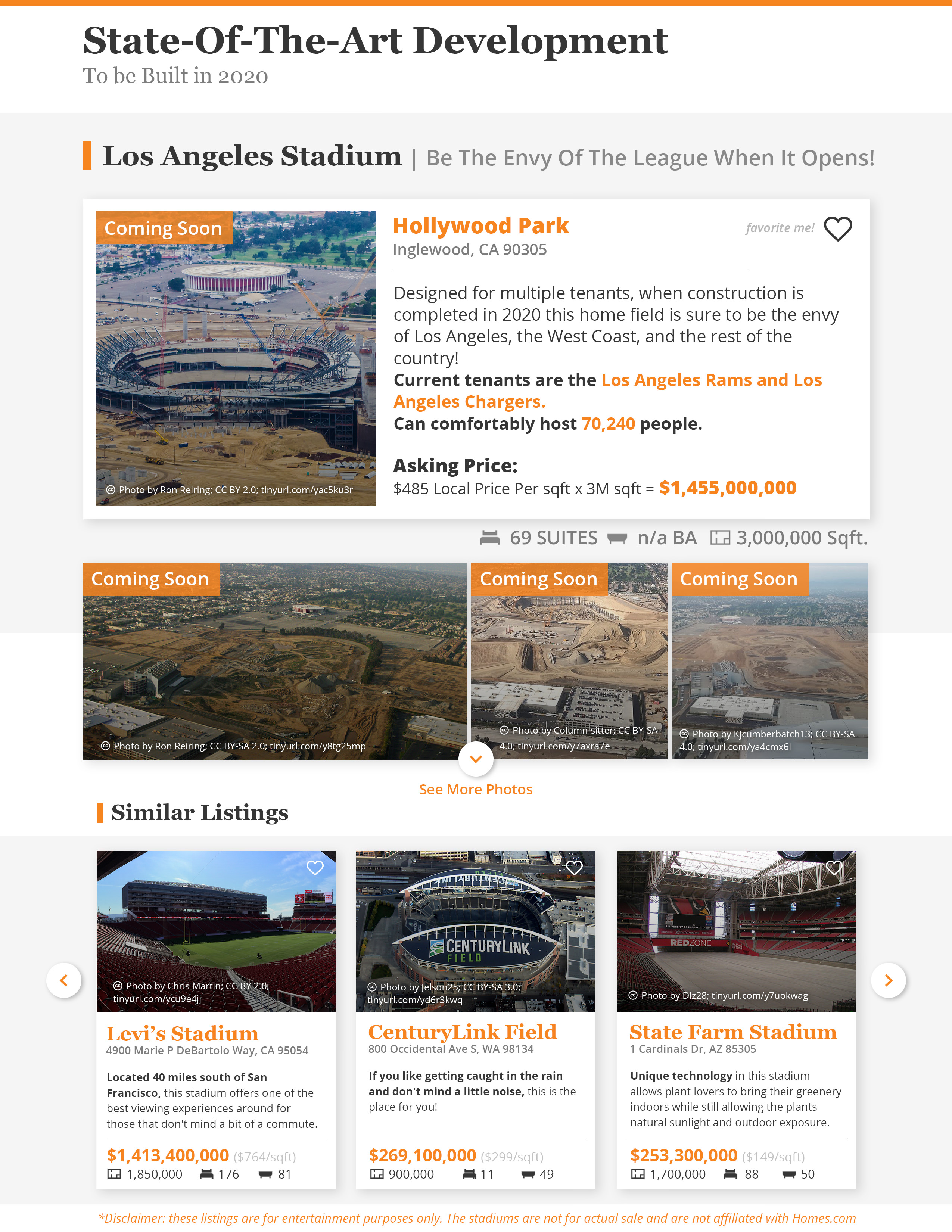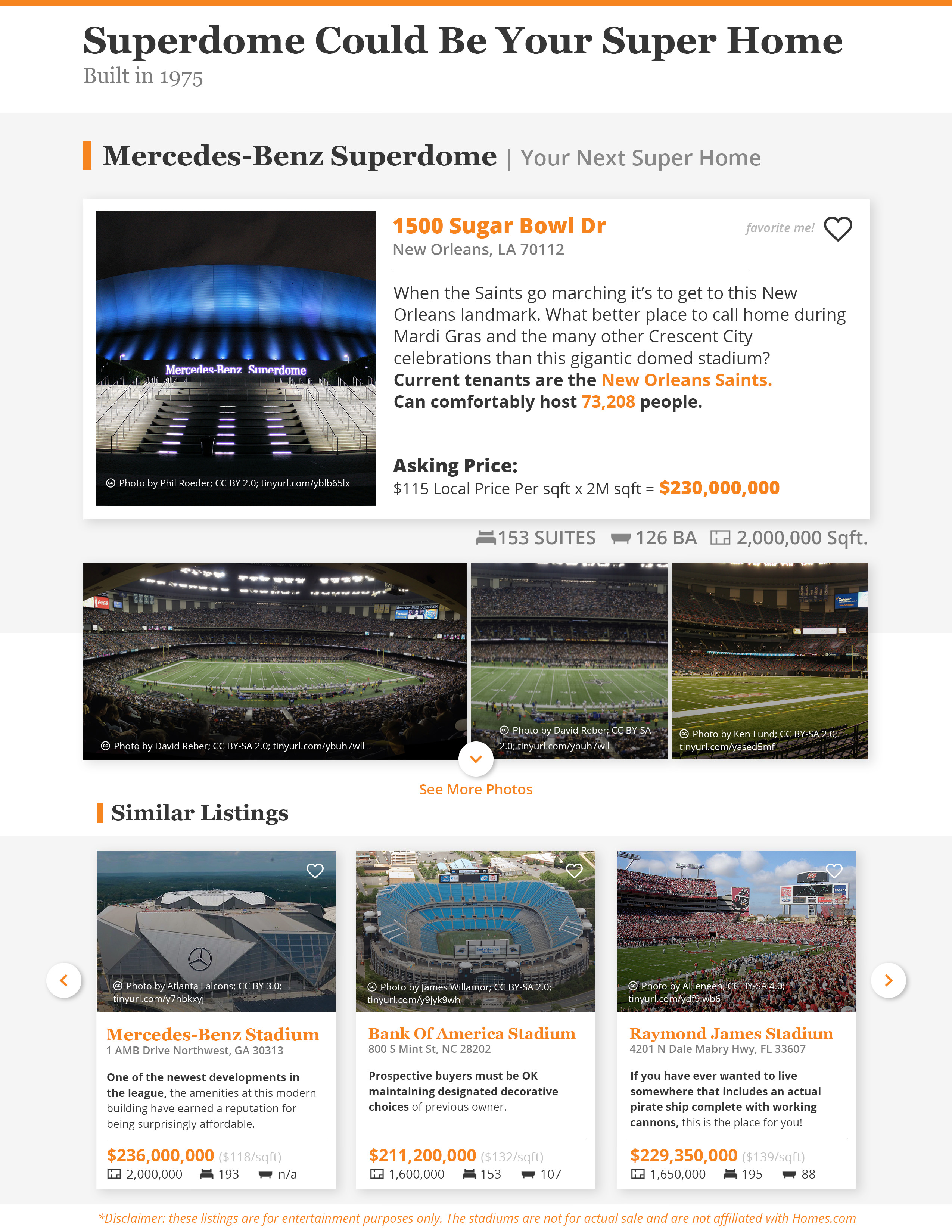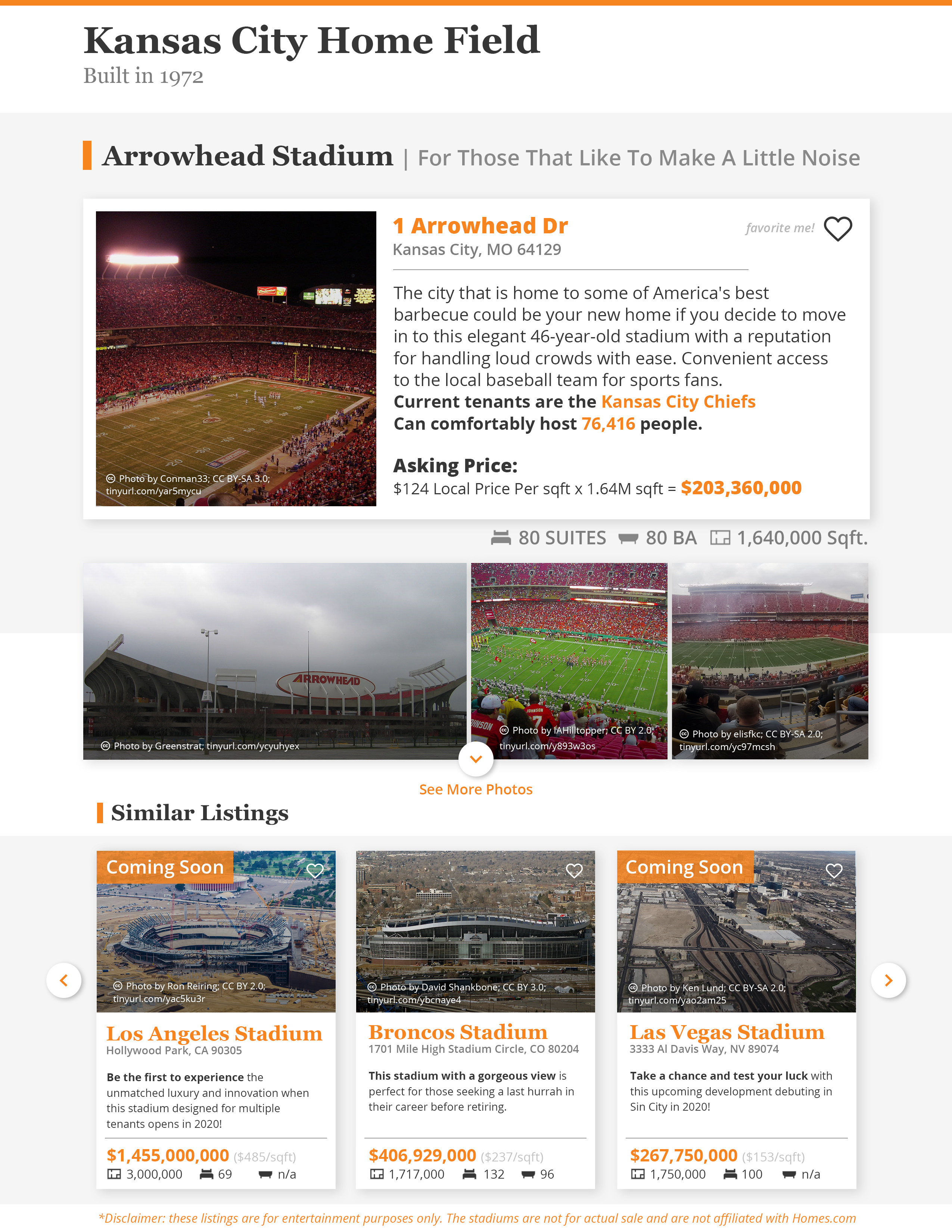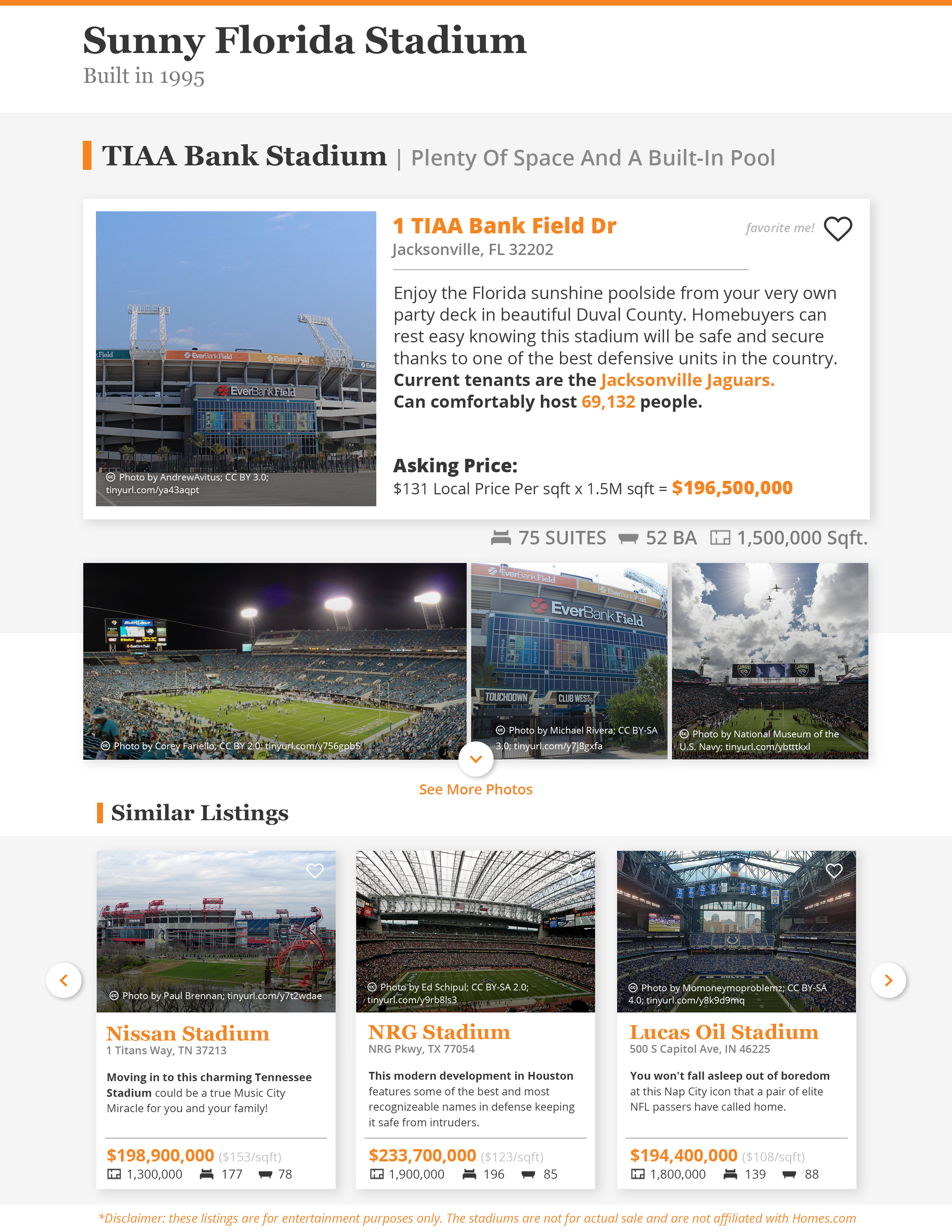 A series of infographics put together by a designer at Homes.com shows the stadiums of last season's division winners as "house for sale" listings. Each features an estimated home sale price based on the median price per square foot of the stadium's location, as well as the actual square footage of the venue.
