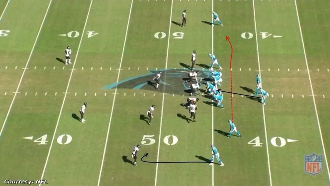 The Panthers run a play-action passing play with a run-pass option element. Newton fakes a handoff to Christian McCaffrey, then looks to throw a backside hitch route to Devin Funchess (No. 17).