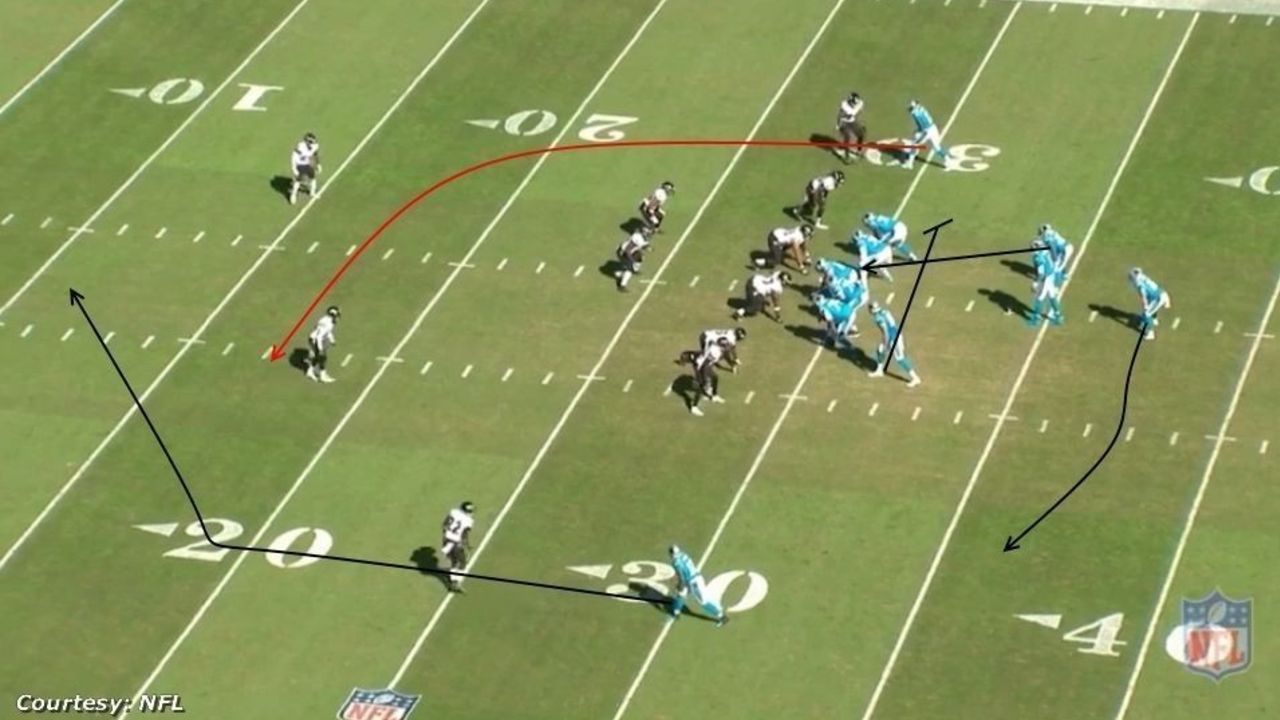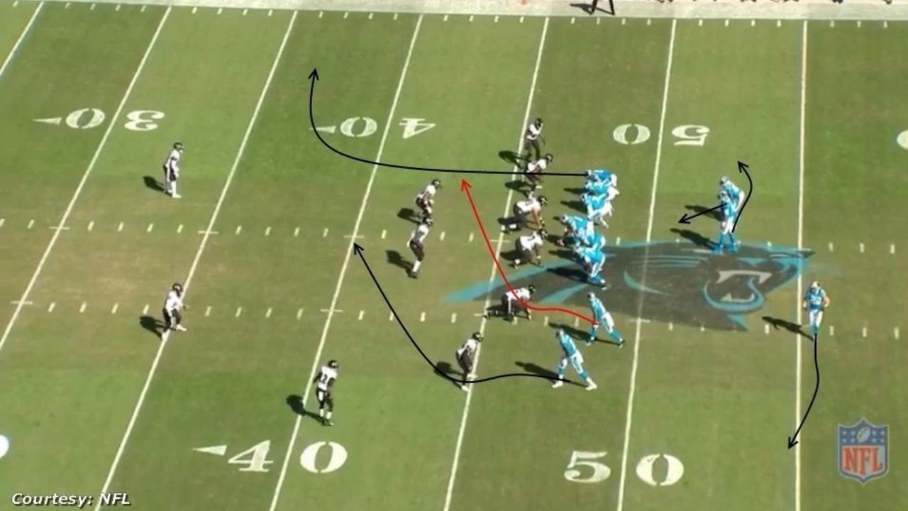 From inside, then to the left and right, the Panthers’ offense stretches Baltimore's defense on this play while giving Newton two potential short throws that have a high possibility of completion.