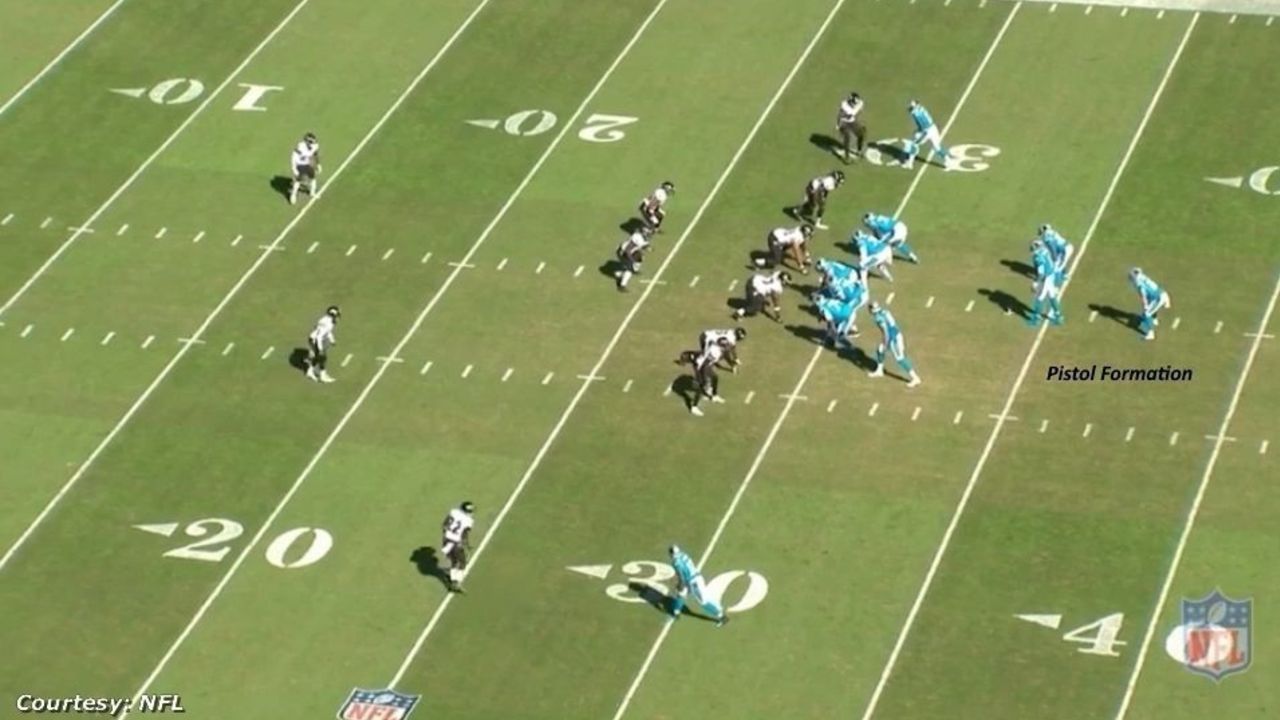 The Panthers put Newton in the shotgun to start the drive and use 11 personnel, with three wide receivers and a tight end joining the passer.