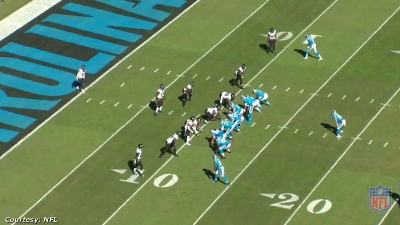 After calling three straight pass plays, Turner decides to keep the ball on the ground to close out this drive. For the first time on this series, Newton lines up under center, and yet again the Panthers use a different offensive personnel package: