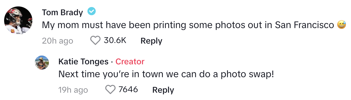 Brady, a native of San Mateo, California, found out about the mishap and left a comment saying his mom must have been printing photos in San Francisco. Tonges replied, suggesting they swap the photos next time the future Hall of Famer is in town.