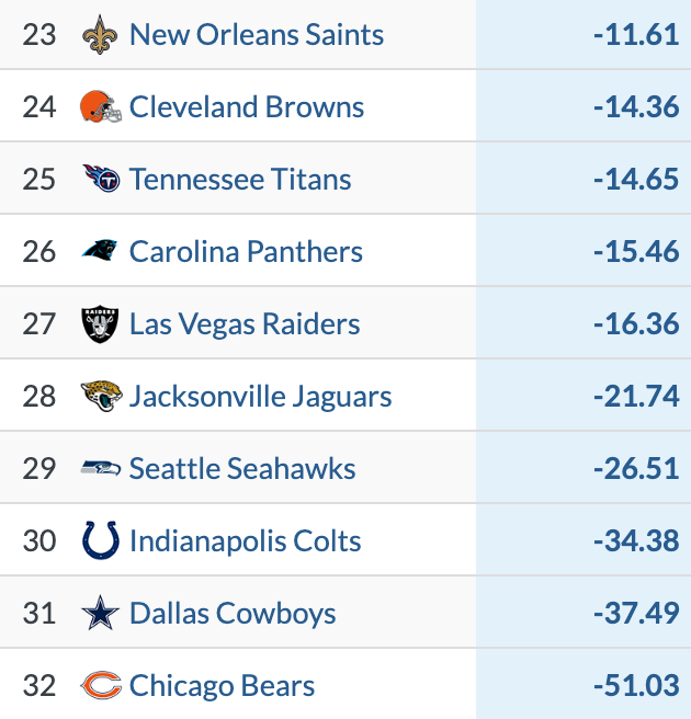 Any MVP talk surrounding Sam Darnold was always a little excessive, but the early-season hype was well-warranted. The veteran quarterback had been playing better than anyone could've expected and was a key factor in Minnesota's 5-0 start. While the Vikings may still be headed for a playoff berth, the quarterback play has taken a turn for the worse. Darnold nearly gave away Sunday's game against the Jaguars, coughing up three interceptions to the NFL's worst defense by EPA/pass. His decision-making is becoming a real problem, but the preseason injury to rookie first-rounder J.J. McCarthy means the Vikings have no choice but to ride this out. Their ceiling will depend on how hot (or not) Darnold is in January. That's a dangerous game to play.