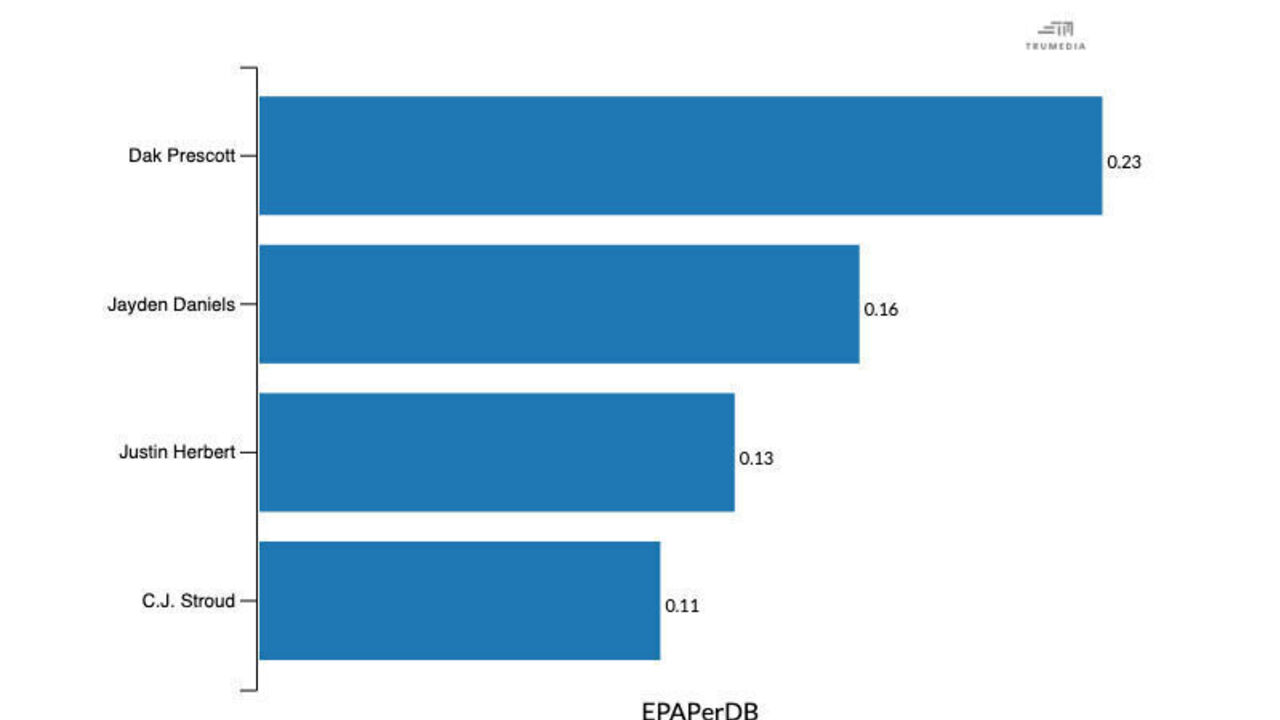 Though Daniels and the Commanders' offense have fallen back down to earth recently, the No. 2 overall pick is still the front-runner to take home this top honor. Daniels leads all quarterbacks in EPA per dropback, according to TruMedia, and it's by some margin. Dating back to 2014, Daniels' EPA per dropback would currently place second among all first-year quarterbacks in that span, trailing only Dak Prescott's 2016 campaign. At this pace, it seems certain he will be named the 2024 OROY.