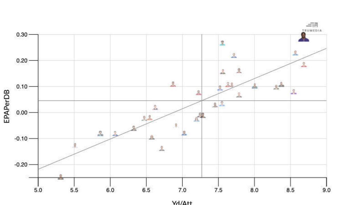 Many thought the 2023 season was Jackson at his peak. Forget that. The Ravens passer took a sledgehammer to his ceiling and is playing even better this year. Jackson owns a 29-to-3 touchdown-to-interception clip and leads the NFL in yards per pass attempt (8.7) and passer rating (116.3). No quarterback has a higher EPA per dropback than Jackson. In fact, he's in a league of his own.