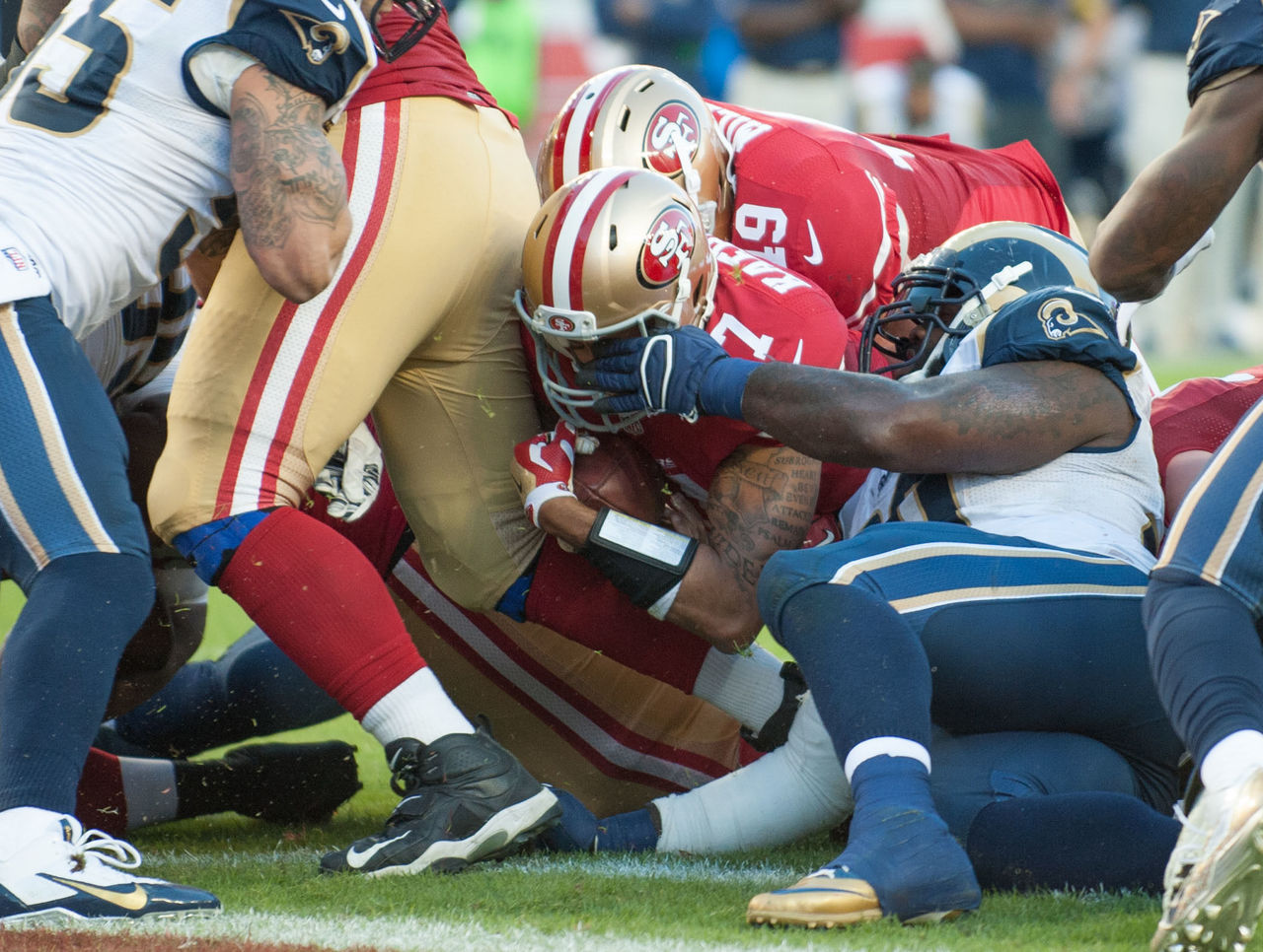 Quarterback Colin Kaepernick fumbled the ball at the goal line with under 10 seconds left on the clock as the San Francisco 49ers lost 13-10 to the St. Louis Rams.